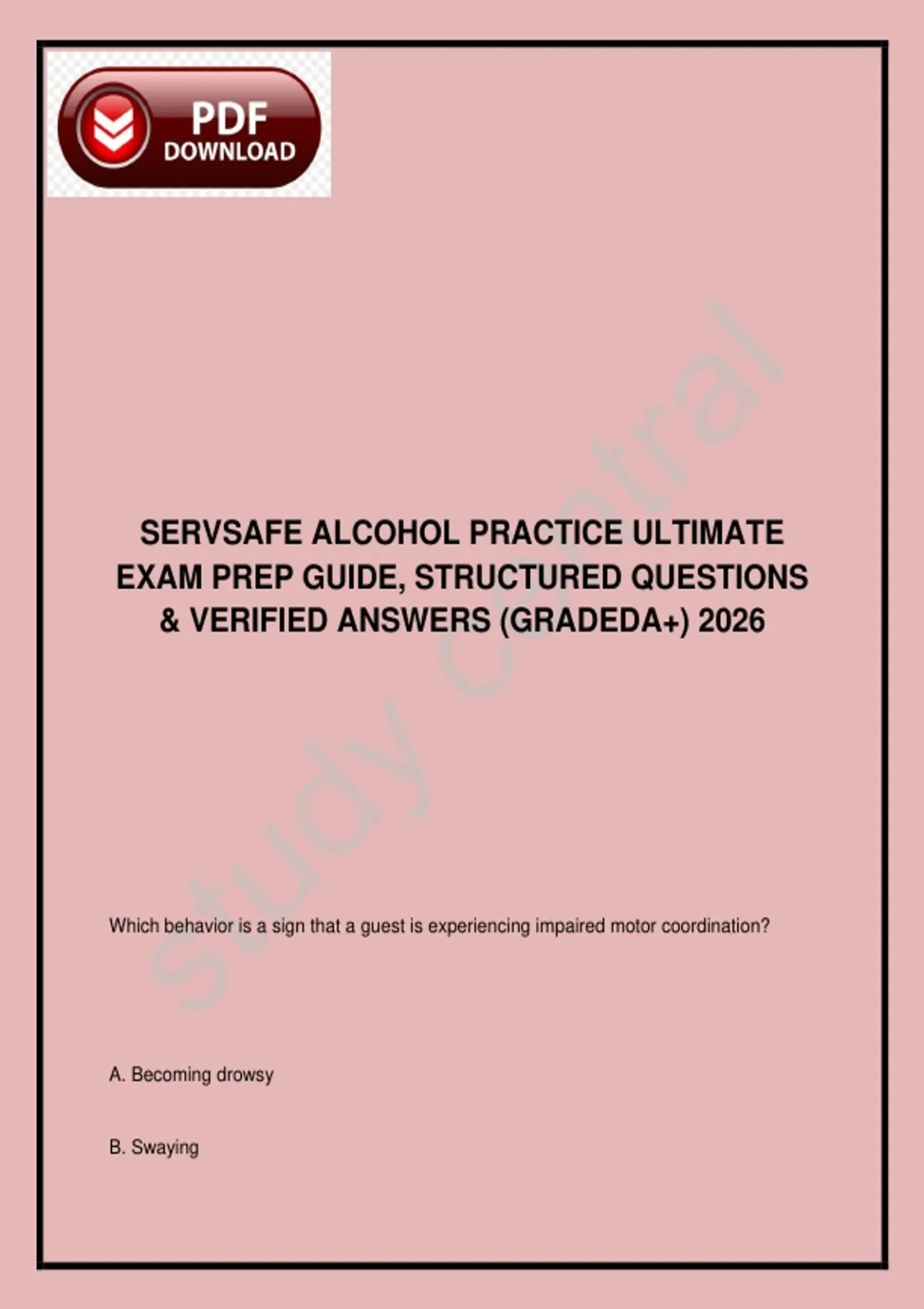 INSTANT PDF DOWNLOAD This ultimate exam prep guide is designed for ServSafe Alcohol certification practice, covering responsible alcohol service, legal obligations, intoxication signs, and intervention strategies. It includes well-structured practice questions with verified answers aligned with the latest 2026 exam standards, making it ideal for confident and high-grade exam preparation.