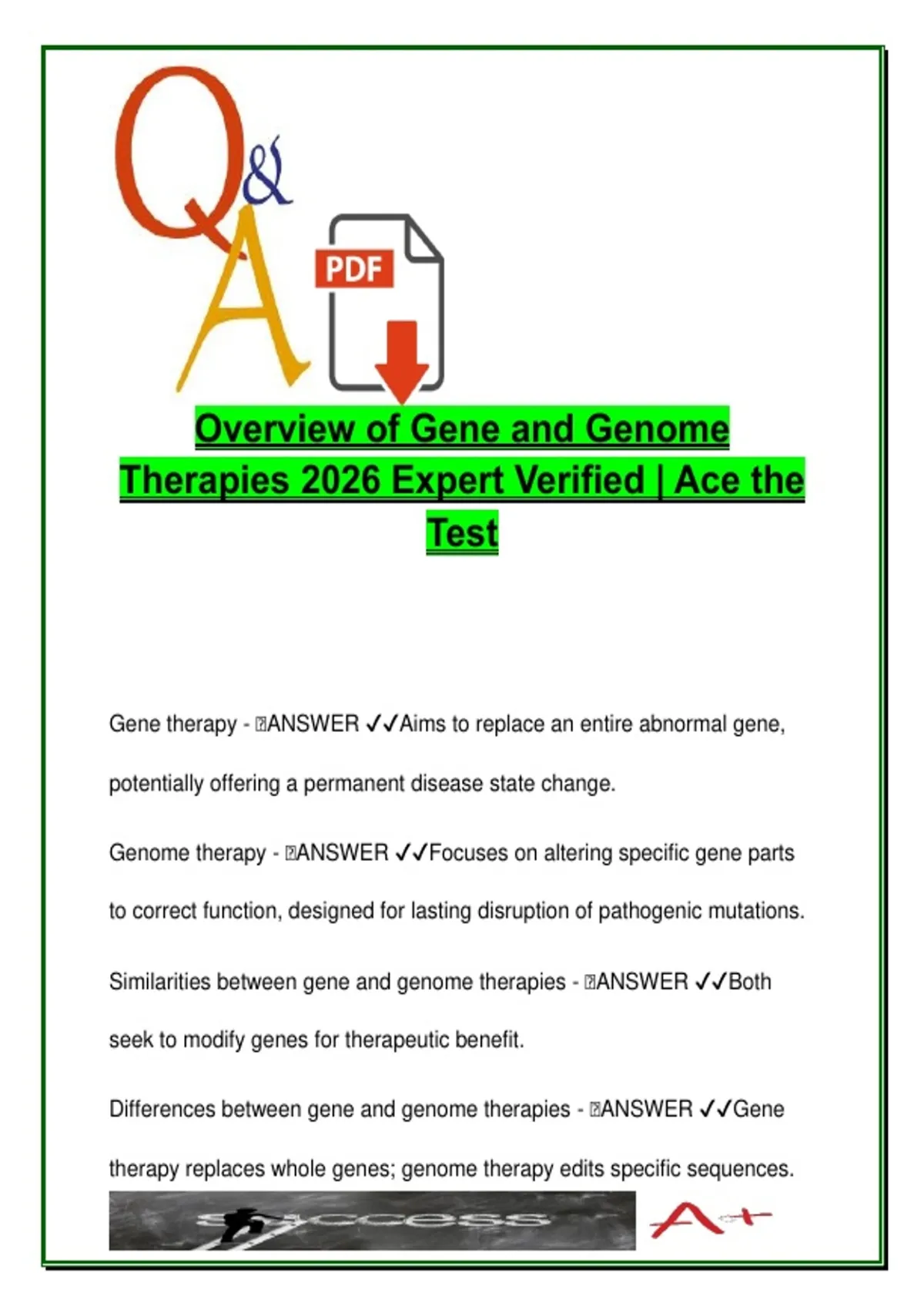Gene therapy - 🧠ANSWER ✔✔Aims to replace an entire abnormal gene,