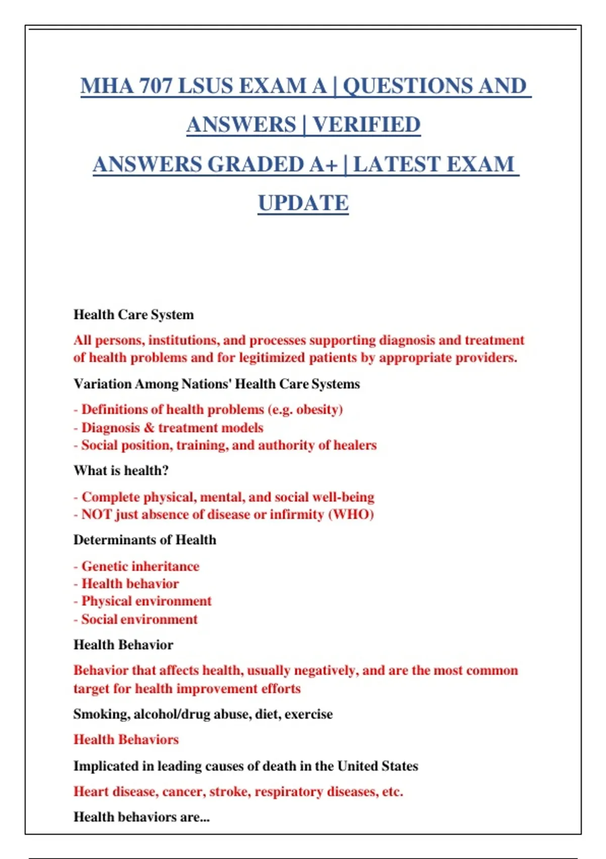 MHA 707 LSUS EXAM A | QUESTIONS AND