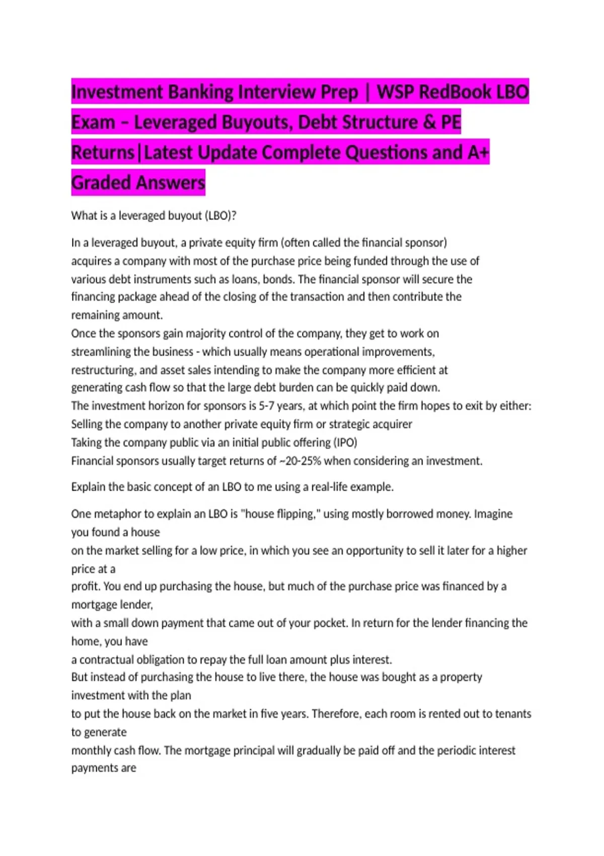 Investment Banking Interview Prep | WSP RedBook LBO Exam – Leveraged Buyouts, Debt Structure & PE Returns|Latest Update Complete Questions and A+ Graded Answers What is a leveraged buyout (LBO)? In a leveraged buyout, a private equity firm (often called the financial sponsor) acquires a company with most of the purchase price being funded through the use of various debt instruments such as loans, bonds. The financial sponsor will secure the financing package ahead of the closing of the transaction and then contribute the remaining amount. Once the sponsors gain majority control of the company, they get to work on streamlining the business - which usually means operational improvements, restructuring, and asset sales intending to make the company more efficient at generating cash flow so that the large debt burden can be quickly paid down. The investment horizon for sponsors is 5-7 years, at which point the firm hopes to exit by either: Selling the company to another private equity firm or strategic acquirer Taking the company public via an initial public offering (IPO) Financial sponsors usually target returns of ~20-25% when considering an investment. Explain the basic concept of an LBO to me using a real-life example. One metaphor to explain an LBO is "house flipping," using mostly borrowed money. Imagine you found a house on the market selling for a low price, in which you see an opportunity to sell it later for a higher price at a profit. You end up purchasing the house, but much of the purchase price was financed by a mortgage lender, with a small down payment that came out of your pocket. In return for the lender financing the home, you have a contractual obligation to repay the full loan amount plus interest. But instead of purchasing the house to live there, the house was bought as a property investment with the plan to put the house back on the market in five years. Therefore, each room is rented out to tenants to generate monthly cash flow. The mortgage principal will gradually be paid off and the periodic interest payments are paid down using the rental income from the tenants. Home renovations are completed with the remaining amount and any existing property damages are fixed - again, using the rental income. After around five years, the house is sold for a price higher than the initial purchase due to the improvements made to the house and because the house is located in an area where home values have been increasing. The remaining mortgage balance will have to be paid in full, but you pocket a greater percentage of the proceeds from the sale of the house because you consistently paid down the principal. What is the intuition underlying the usage of debt in an LBO? The typical transaction structure in an LBO is financed using a high percentage of borrowed funds, with a relatively small equity contribution from the financial sponsor. As the debt principal is paid down throughout the holding period, the sponsor will realize greater returns at exit. Therefore, private equity firms attempt to maximize the amount of leverage while keeping the debt level manageable to avoid bankruptcy risk. The logic behind why it's beneficial for sponsors to contribute minimal equity is due to debt having a lower cost of capital than equity. One reason the cost of debt is lower is that debt is higher on the capital structure - as well as the interest expense being tax-deductible, which creates a "tax shield." Thus, the increased leverage enables the firm to reach its returns threshold easier. What is the typical capital structure prevalent in LBO transactions? LBO capital structures are cyclical and fluctuate depending on the financing environment, but there has been a structural shift from D/E ratios of 80/20 in the 1980s to around 60/40 in more recent years. The different debt tranches include leveraged loans (revolver, term loans), senior notes, subordinated notes, high-yield bonds, and mezzanine financing. The majority of the debt raised will be senior, secured loans by banks and institutional investors before riskier types of debt are used. In terms of equity, the contribution from the financial sponsor represents the largest source of LBO equity. Sometimes, the existing management team