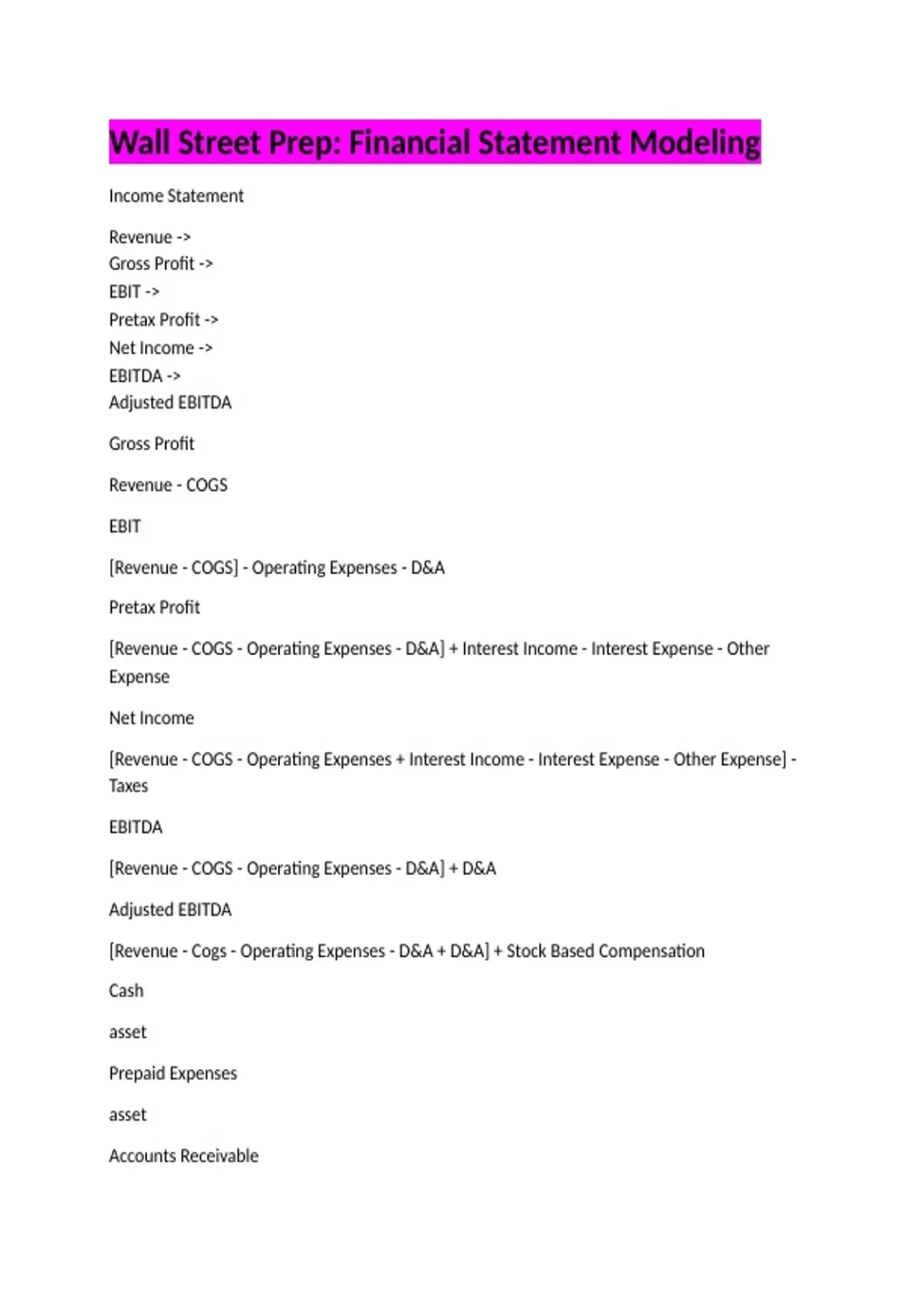 Wall Street Prep: Financial Statement Modeling Income Statement Revenue -> Gross Profit -> EBIT -> Pretax Profit -> Net Income -> EBITDA -> Adjusted EBITDA Gross Profit Revenue - COGS EBIT [Revenue - COGS] - Operating Expenses - D&A Pretax Profit [Revenue - COGS - Operating Expenses - D&A] + Interest Income - Interest Expense - Other Expense Net Income [Revenue - COGS - Operating Expenses + Interest Income - Interest Expense - Other Expense] - Taxes EBITDA [Revenue - COGS - Operating Expenses - D&A] + D&A Adjusted EBITDA [Revenue - Cogs - Operating Expenses - D&A + D&A] + Stock Based Compensation Cash asset Prepaid Expenses asset Accounts Receivable asset Inventory asset PP&E asset Accounts Payable liability Deferred Revenue liability