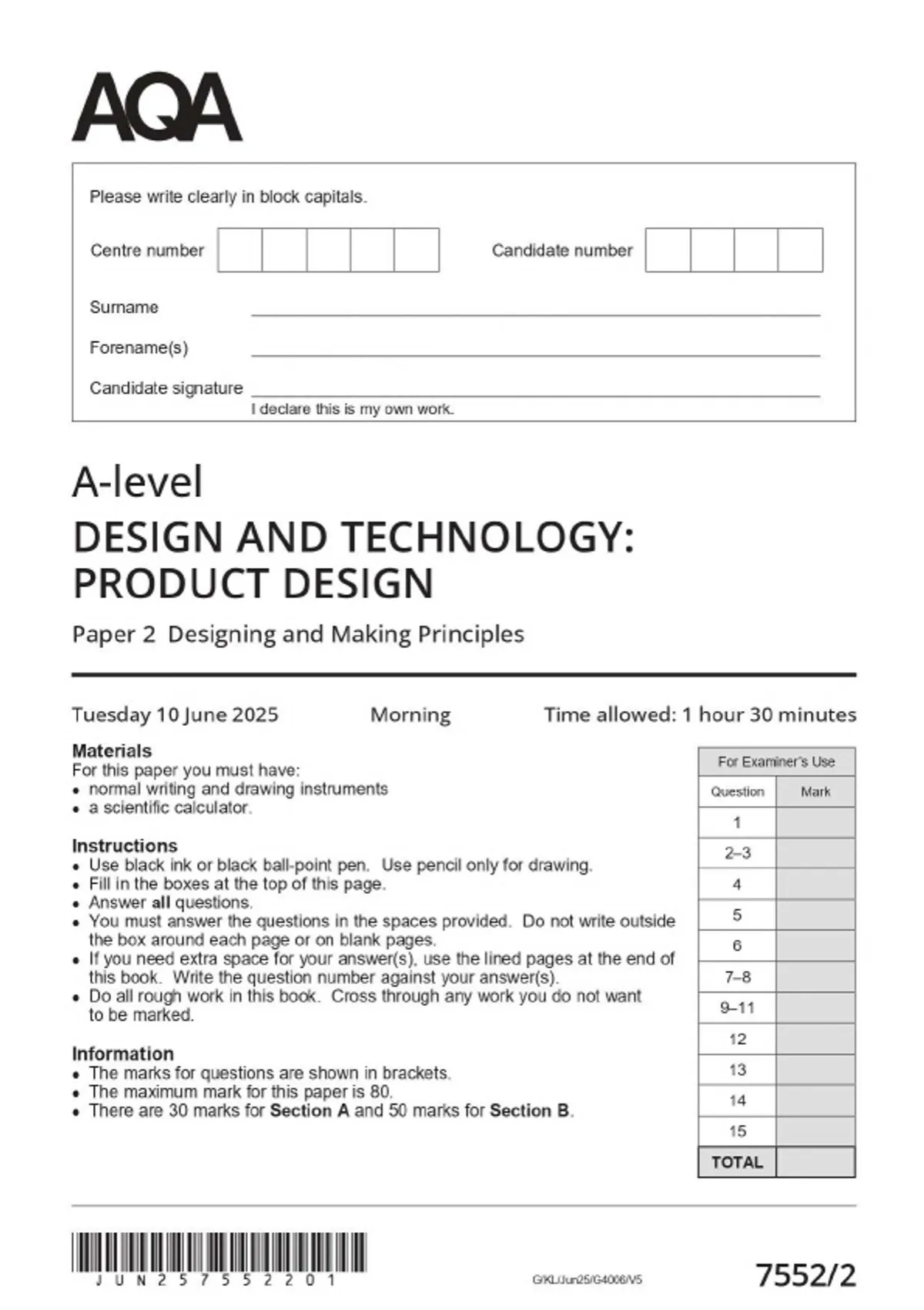 2025 AQA A-LEVEL DESIGN AND TECHNOLOGY: PRODUCT DESIGN 7552/2 Paper 2 Designing and Making Principles MERGED QUESTION PAPER & MARKSCHEME