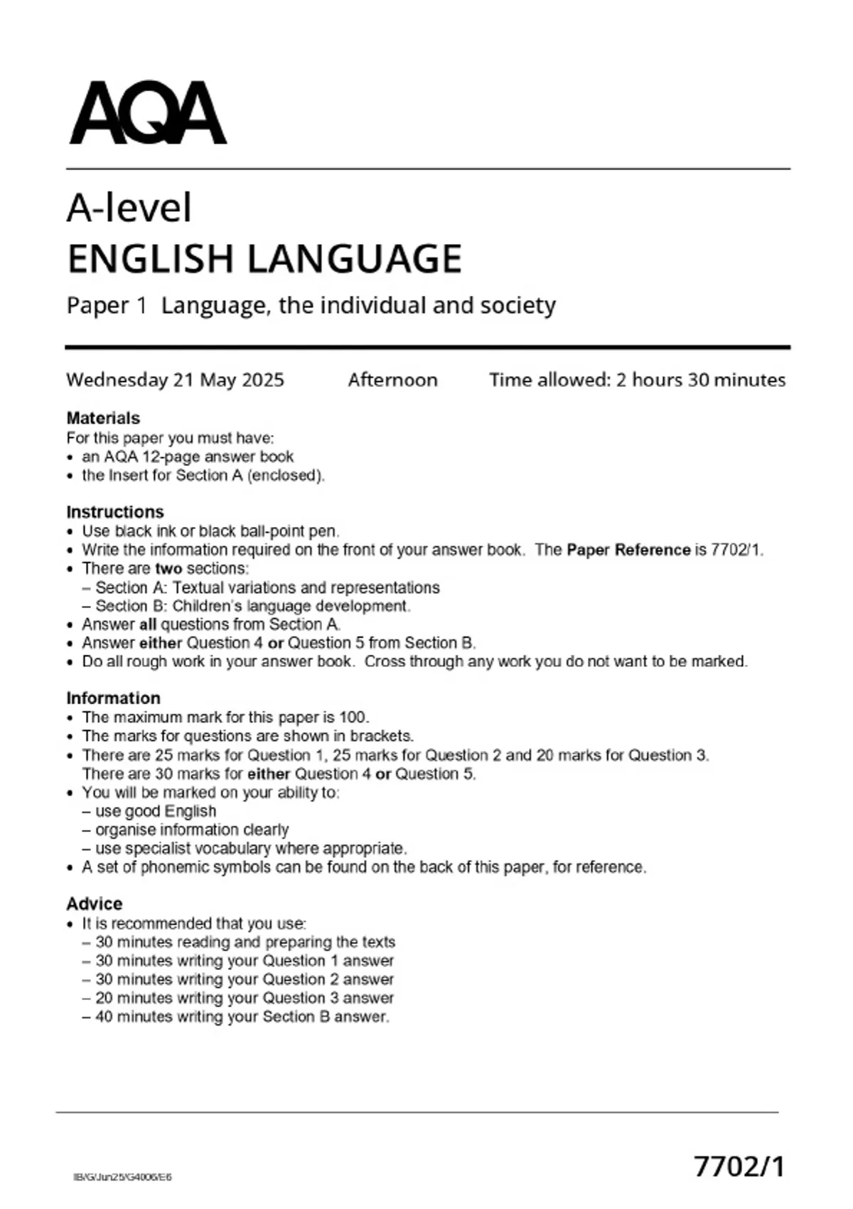 2025 AQA A-LEVEL English Language 7702/1 Paper 1 Language, the individual and society MERGED QUESTION PAPER & MARKSCHEME
