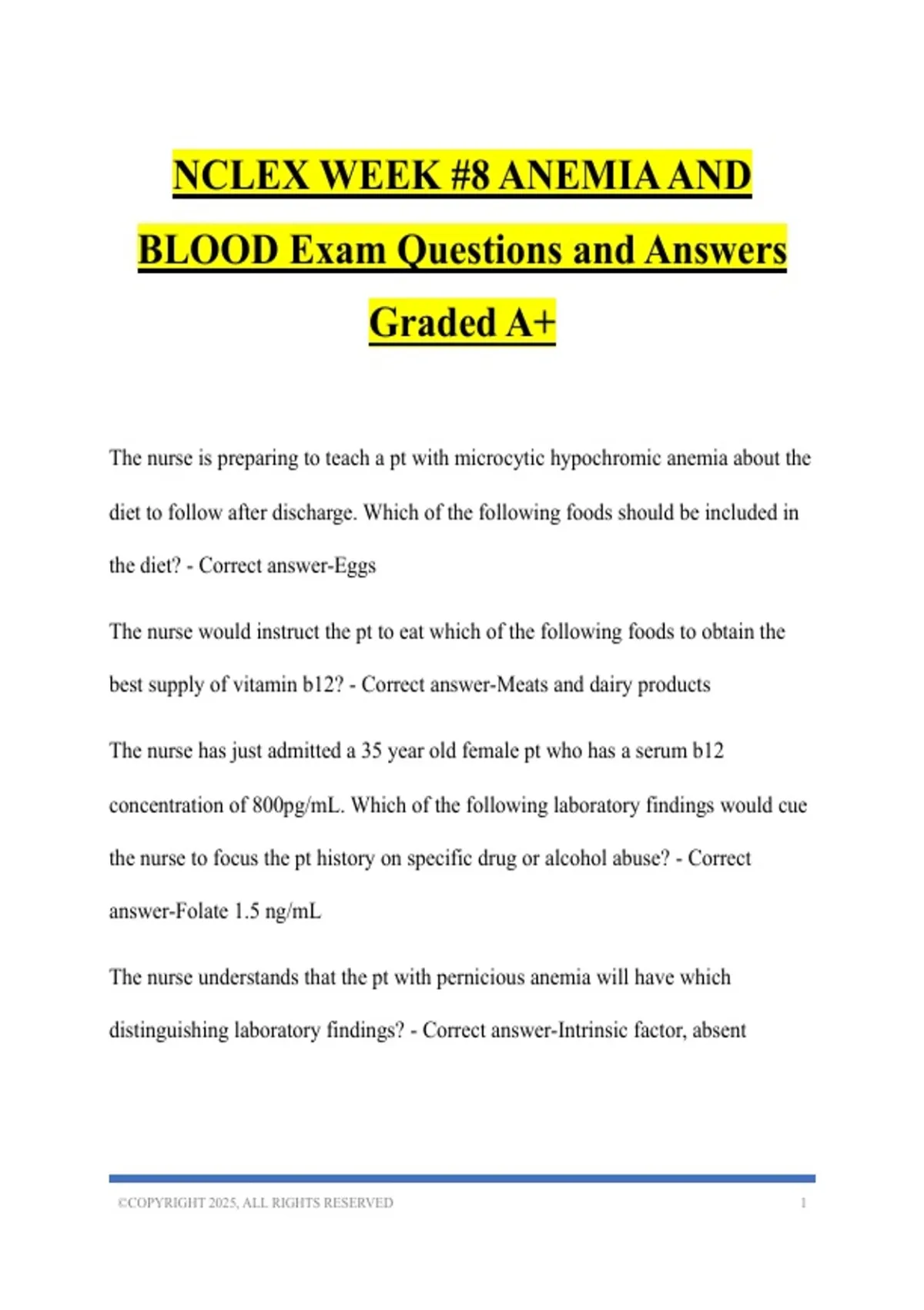NCLEX WEEK #8 ANEMIA AND BLOOD Exam Questions and Answers Graded A+