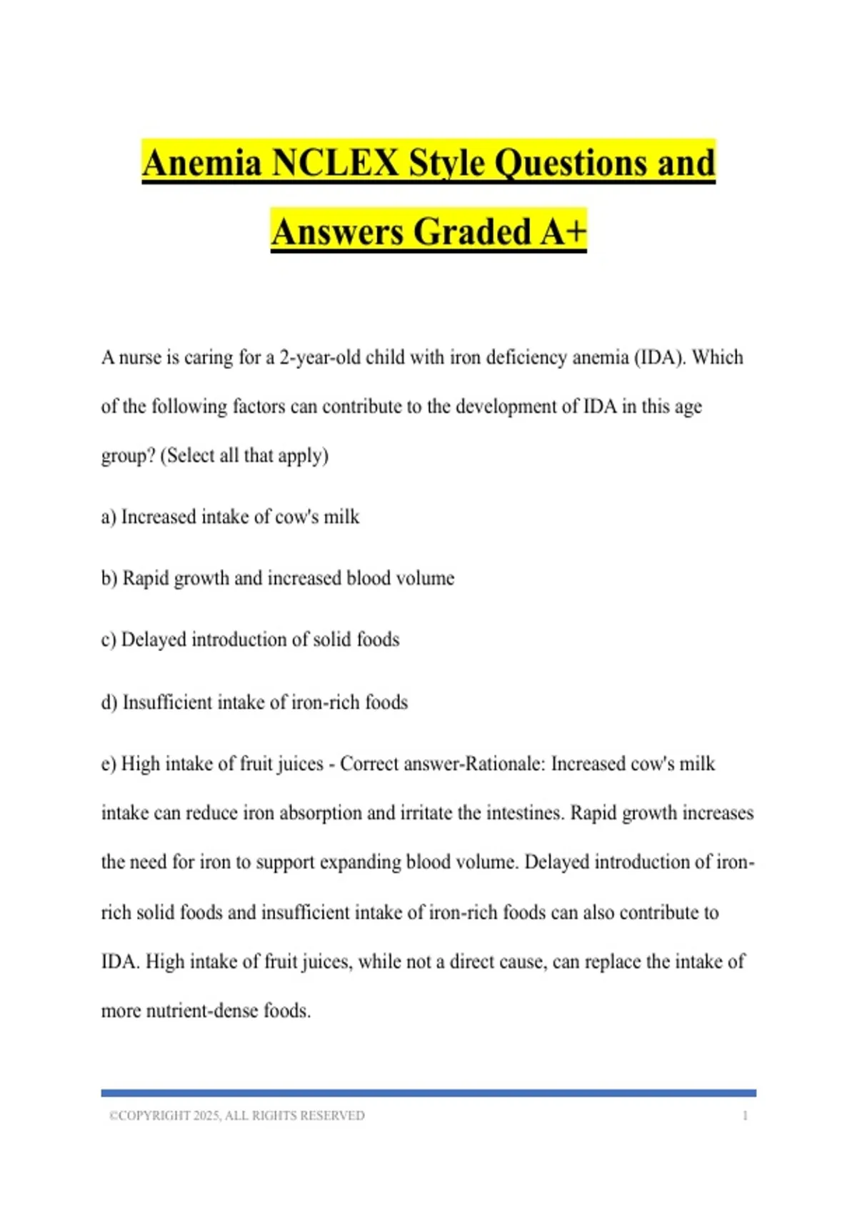 e) High intake of fruit juices - Correct answer-Rationale: Increased cow's milk