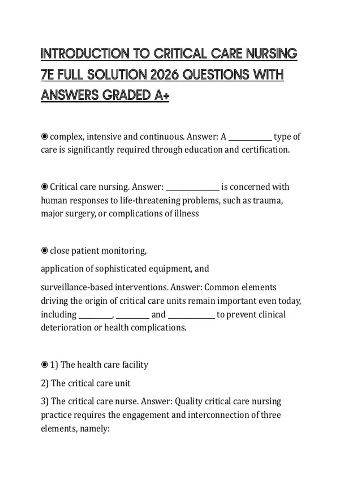 ◉ Critical care nursing. Answer: ________________ is concerned with
