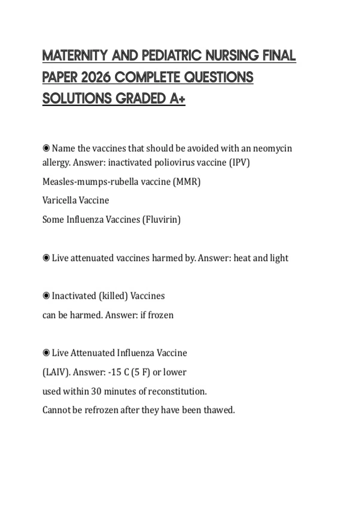 MATERNITY AND PEDIATRIC NURSING FINAL PAPER 2026 COMPLETE QUESTIONS SOLUTIONS GRADED A+