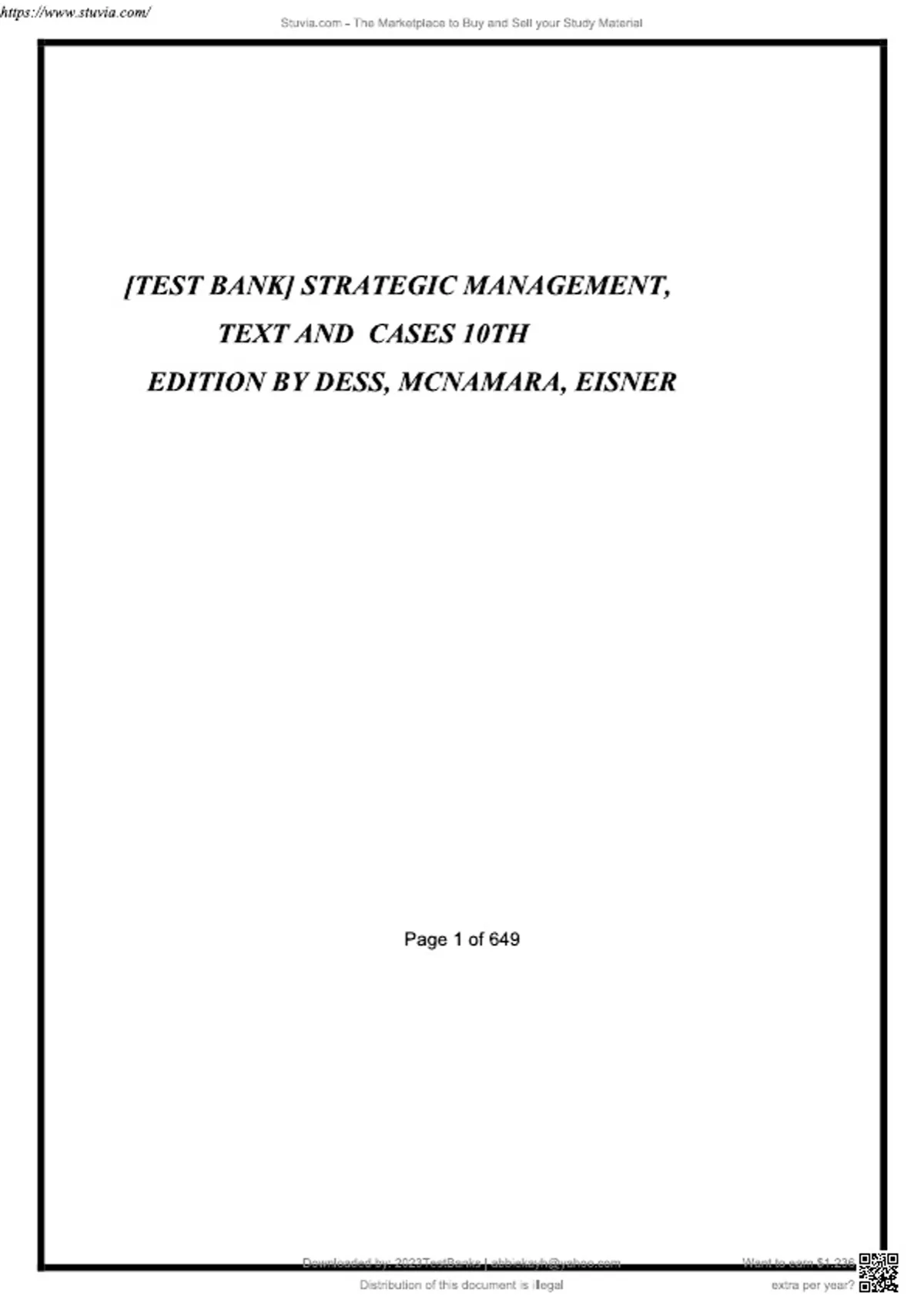 This document provides the complete test bank for the 10th edition of Strategic Management: Text and Cases by Dess, McNamara, and Eisner. It includes practice questions with answers covering strategic analysis, formulation, and implementation, competitive advantage, corporate governance, business ethics, and real-world case applications. This resource is designed to support exam preparation and deepen understanding of strategic management concepts and practices.