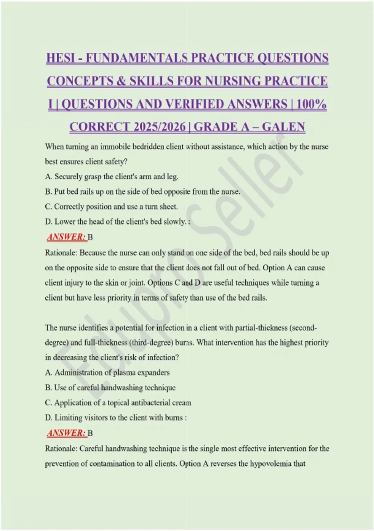 HESI - FUNDAMENTALS PRACTICE QUESTIONS CONCEPTS & SKILLS FOR NURSING PRACTICE I | QUESTIONS AND VERIFIED ANSWERS | 100% CORRECT 2025/2026 | GRADE A – GALEN