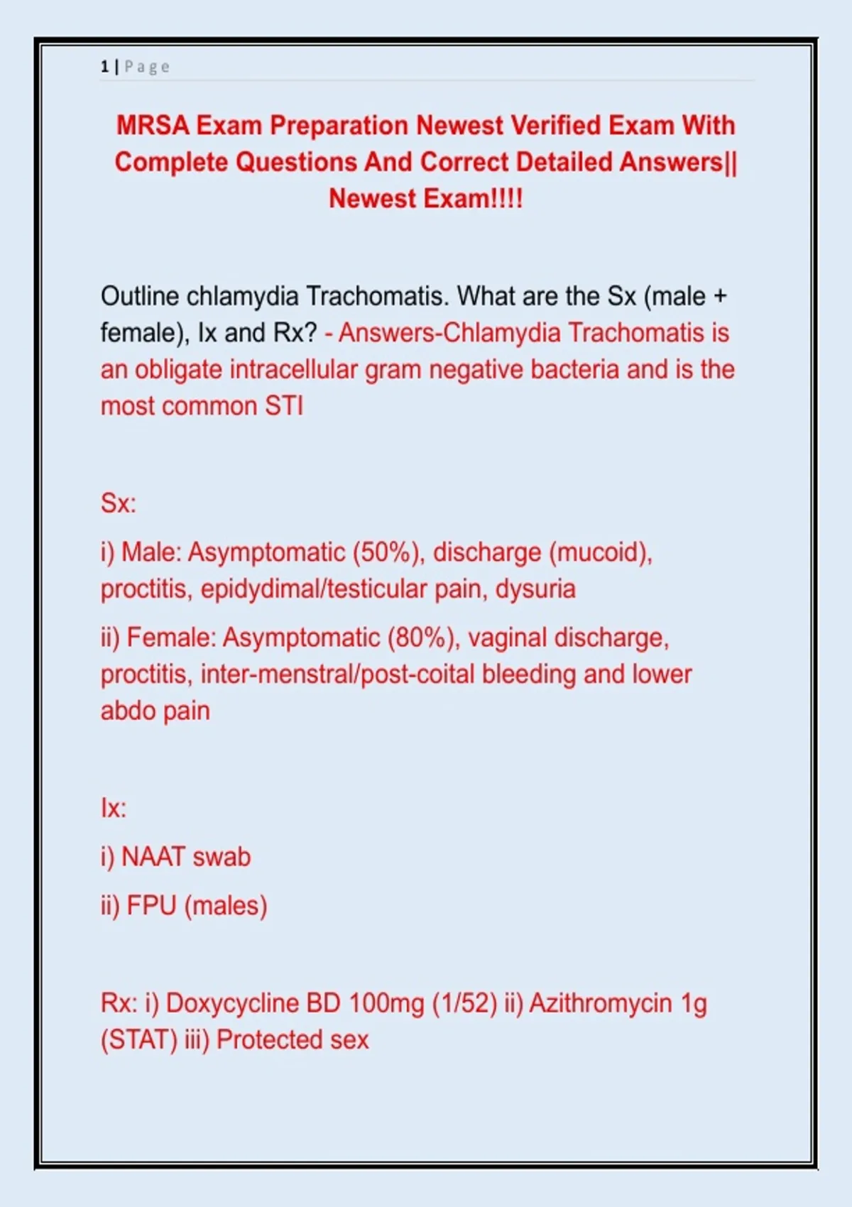 MRSA Exam Preparation Newest Verified Exam With Complete Questions And Correct Detailed Answers|| Newest Exam!!!!