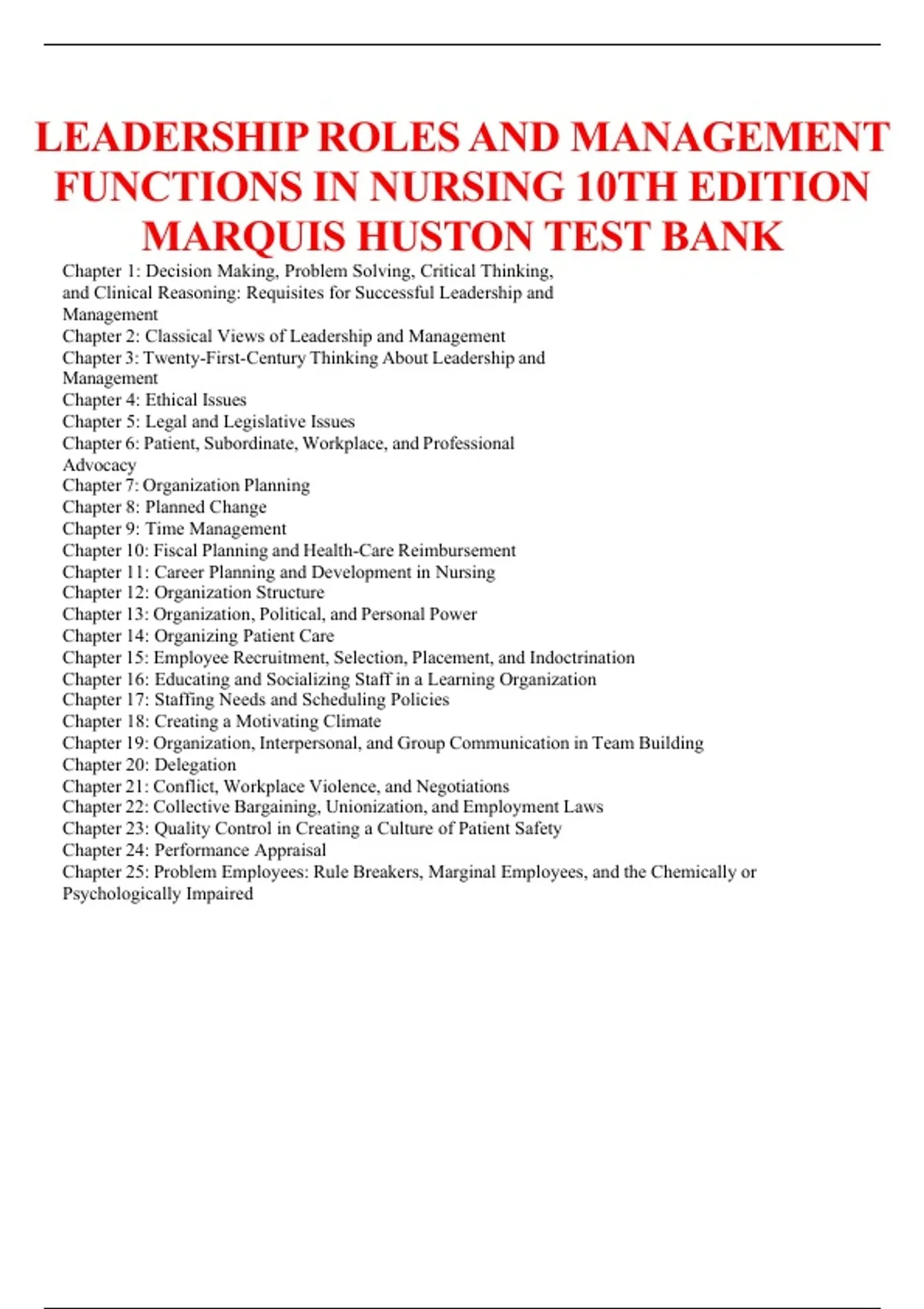 This 2026/2027 Test Bank for Leadership Roles and Management Functions in Nursing, 10th Edition by Bessie L. Marquis provides a comprehensive set of questions for nursing students preparing for exams in leadership, management, and administration. The questions cover critical concepts such as decision-making, delegation, organizational strategies, and patient care coordination, supporting exam readiness, clinical reasoning, and applied nursing practice.