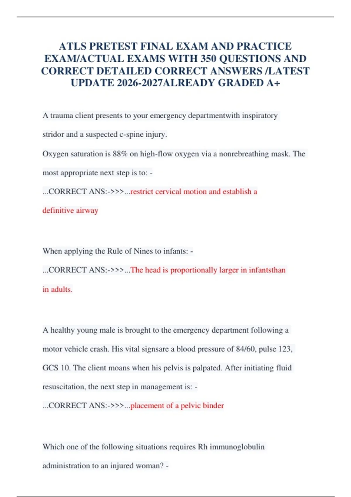 ,...CORRECT ANS:->>>...positive pregnancy test, Rh negative, and hastorso