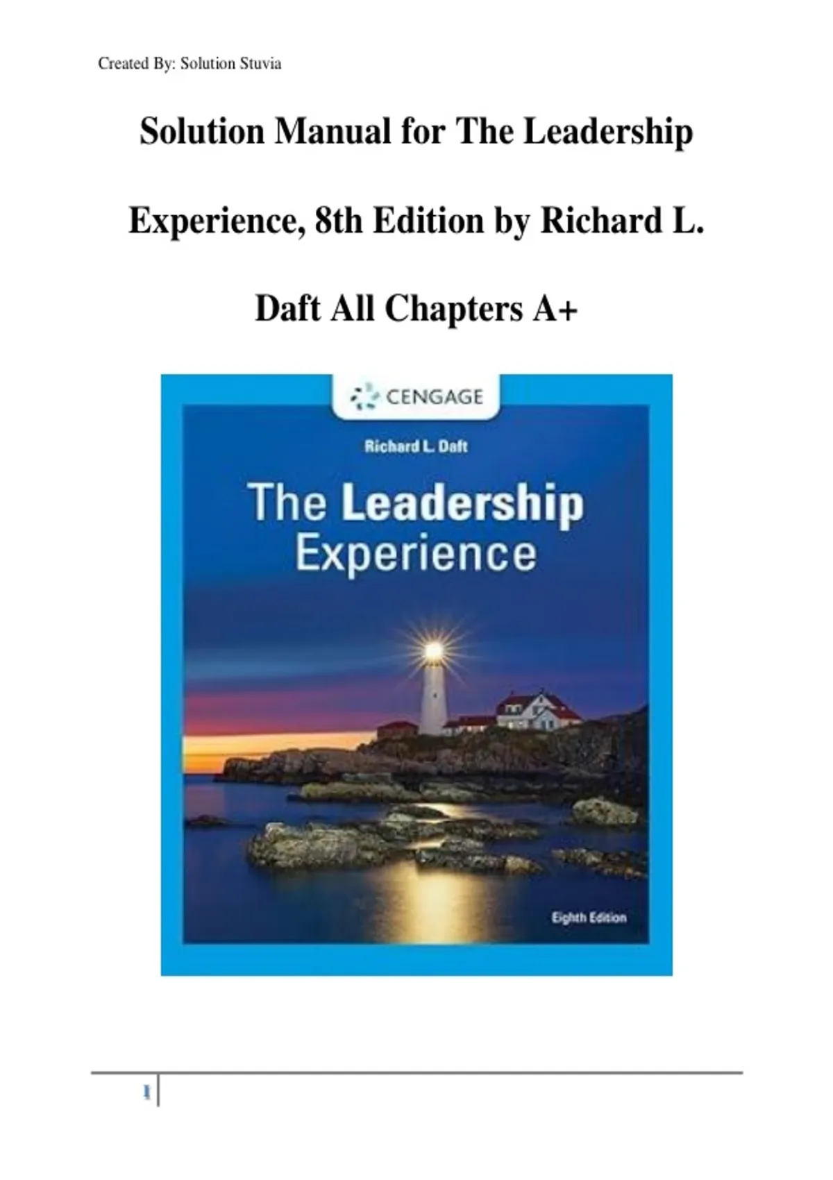 This document contains a comprehensive solution manual for The Leadership Experience (8th Edition) by Richard L. Daft, covering all chapters with detailed explanations, key concepts, and discussion guidance. It supports students in understanding leadership theories, leadership versus management, new leadership paradigms, and practical applications aligned with course objectives and exams.