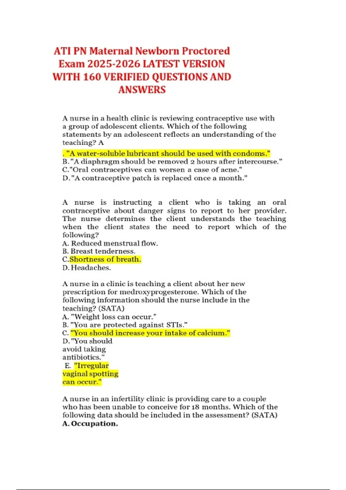 ATI PN Maternal-Newborn Nursing Exam-Aligned Practice & Review Pack (2025/2026 Update) 160 Questions | Multiple Versions | Correct Answers & Detailed Rationales Prepare confidently for the ATI PN Maternal-Newborn proctored exam with this comprehensive, exam-aligned practice and review pack. Designed for PN students, this resource mirrors the scope, clinical focus, and reasoning style required in modern maternal-newborn nursing exams. This pack provides 160 original, high-quality practice questions organized to support deep learning, repeated practice, and mastery of maternal-newborn nursing concepts. Built for PN Maternal-Newborn Exam Success ATI PN Maternal-Newborn exams assess students’ ability to: Apply knowledge of maternal physiology and newborn adaptation Prioritize safe care for mothers and infants Recognize complications and intervene appropriately Demonstrate evidence-based, patient-centered judgment This practice pack emphasizes critical thinking, clinical decision-making, and safe nursing practice, reflecting the NGN-inspired style of current proctored exams, without relying on memorization of unauthorized exam content. What’s Included in This Maternal-Newborn Practice Pack 160 Exam-Aligned Questions Covers high-yield topics commonly tested in PN maternal-newborn courses. Multiple Practice Versions Organized into multiple versions to allow repeated practice with different scenario wording, enhancing retention and exam readiness. Original Questions Only All questions are newly written and exam-aligned, not copied from ATI or any proprietary test banks. Correct Answers Clearly Marked Each question includes the correct answer for accurate self-assessment. Detailed, Educational Rationales Rationales clarify: Why the correct answer is best Why other options are less appropriate Key maternal-newborn concepts required for PN practice Balanced Difficulty Questions range from moderate to advanced, helping PN students prepare for the full range of exam challenges. Core Maternal-Newborn Nursing Topics Covered This review pack provides comprehensive coverage of maternal-newborn nursing for PN students, including: Antepartum Nursing Maternal physiologic changes Fetal growth and development Prenatal assessment and screening High-risk pregnancies (e.g., gestational diabetes, hypertension) Common prenatal discomforts Intrapartum Nursing Stages and signs of labor Fetal monitoring Pain management and labor support Normal and abnormal labor patterns Maternal and fetal complications Postpartum Nursing Maternal physiologic recovery Postpartum hemorrhage Infection prevention Emotional adaptation and postpartum depression Patient education and discharge planning Newborn Nursing Transition to extrauterine life Initial assessment and stabilization Thermoregulation Feeding and nutrition Common neonatal complications (hypoglycemia, jaundice, prematurity) High-Risk Maternal Conditions Preeclampsia/eclampsia Hemorrhagic disorders Cardiopulmonary complications Infection and sepsis High-Risk Neonatal Conditions Respiratory distress Prematurity complications Congenital anomalies Infection prevention and management Maternal-Newborn Pharmacology Uterotonics and tocolytics Analgesics and anesthetics Maternal medications and neonatal effects Patient safety in medication administration Family-Centered Care & Education Family involvement in care Cultural considerations in maternal-newborn nursing Patient education and advocacy Ethical and legal considerations