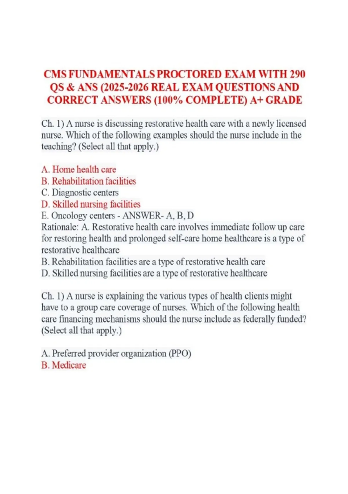 CMS Fundamentals Nursing Exam-Aligned Practice & Review Pack (2025/2026 Update) 300 Questions | Multiple Versions | Correct Answers & Detailed Rationales Prepare confidently for the CMS Fundamentals proctored exam with this comprehensive, exam-aligned practice and review pack, designed to mirror the content, scope, and clinical reasoning expectations of modern CMS-style assessments. This resource provides 300 original, high-quality practice questions, giving nursing students the opportunity to test knowledge, improve clinical reasoning, and approach their exam with confidence.