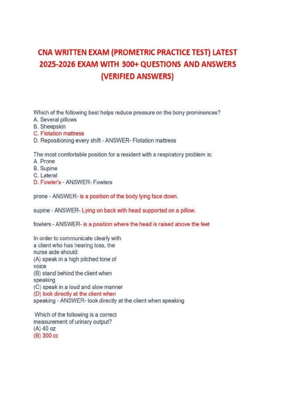 CNA Written Exam Practice & Review Pack (2025/2026 Update) 300+ Questions | Multiple Versions | Correct Answers & Detailed Rationales Prepare confidently for the CNA Written (Prometric-style) exam with this comprehensive, exam-aligned practice and review pack. Designed for nursing assistants and CNA students, this resource mirrors the content, structure, and clinical reasoning expectations required in modern CNA assessments. This pack provides 300+ original, high-quality practice questions, giving students the opportunity to test knowledge, improve clinical reasoning, and approach the exam with confidence.