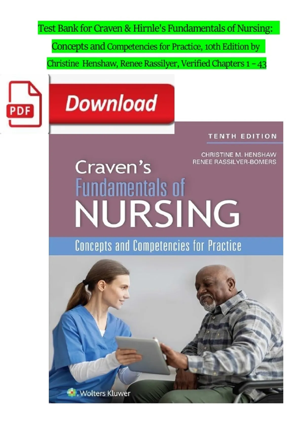 Test Bank for Craven & Hirnle's Fundamentals of Nursing: Concepts and Competencies for Practice, 10th Edition by Christine Henshaw, Renee Rassilyer, Verified Chapters 1 – 43