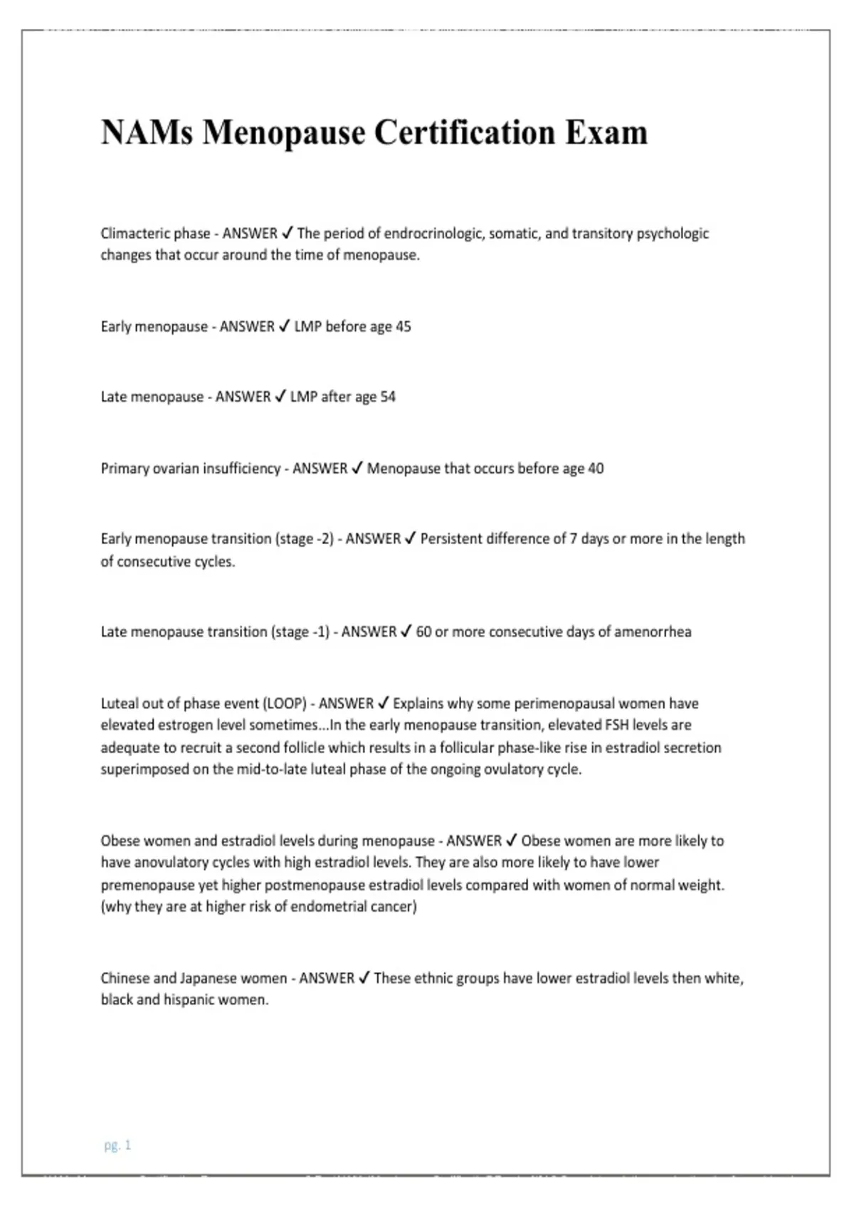 This 2026/2027 Test Bank for the NAMS Menopause Certification Exam provides a complete set of practice questions with rationalized answers covering perimenopause, postmenopause, hormone therapy, symptom management, and evidence-based clinical guidelines. Designed for nurses and healthcare professionals specializing in women’s health, this guide emphasizes applied knowledge, clinical reasoning, and exam readiness, making it an essential resource for mastering menopause concepts and achieving success in the NAMS certification exam.