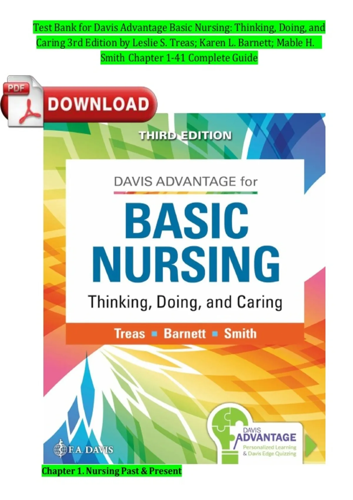 Test Bank for Davis Advantage Basic Nursing: Thinking, Doing, and Caring 3rd Edition by Leslie S. Treas; Karen L. Barnett; Mable H. Smith Chapter 1-41 Complete Guide