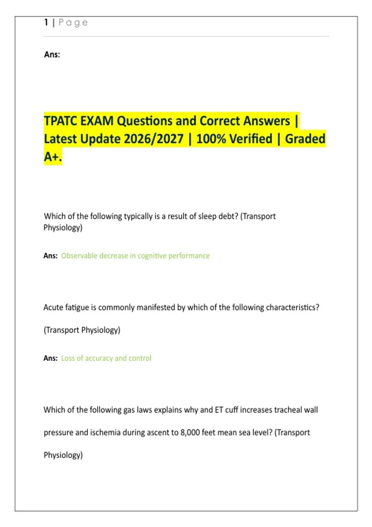 TPATC EXAM Questions and Correct Answers | Latest Update 2026/2027 | 100% Verified | Graded A+.Which of the following typically is a result of sleep debt? (Transport Physiology) Ans: Observable decrease in cognitive performance Acute fatigue is commonly manifested by which of the following characteristics? (Transport Physiology) Ans: Loss of accuracy and control Which of the following gas laws explains why and ET cuff increases tracheal wall pressure and ischemia during ascent to 8,000 feet mean sea level? (Transport Physiology) 2 | P a g e Ans: Ans: Boyle's law Which of the following sensory inputs is most reliable during flight? (Transport Physiology) Ans: Visual perception of speed and direction Which of the following features is most important in a successful safety program? (Safety Policies) Ans: Attitude Which of the following is addressed in the 2018 ASTNA position paper Transport Nurse Safety in the Transport Environment? (Safety Policies) Creating healthy work environements 3 | P a g e Ans: Which of the following is considered the most common side effects of sleep inertia? (Safety Policies) Ans: Slows speed of cognitive task performance Which of the following is one of the four key elements of an appropriate transfer as required by EMTALA? (Legal aspects of critical care) Ans: The sending facility provides treatment within capacity to minimizer patient risk Breach of confidentiality is an example of: (legal aspects of critical care) Ans: A quasi-intentional tort Delegated medical practice, interventions, and procedures administered by the transport team are dictated by which of the following? (Legal aspects of critical care) Ans: off-line and on-line medical direction 4 | P a g e Ans: In the pretrial phase of a lawsuit, information from which of the following patient care discussions is most likely to be protected from discovery by the patient's attorney? (legal aspects of critical care) Ans: Continuous quality improvement records Tympanic membrane rupture can occur as a result of which of the following types of blast injury? (disaster and mass-casualty incidents) Ans: Primary Alcohol or dugs must not be consumed for at least how many hours before a shift (Safety Policies) Ans: 12 5 | P a g e Ans: In the early afternoon or before bedtime, typical sleep latency, the time it takes to fall asleep, usually ranges from? (Safety Policies) Ans: 7-8 mins Which of the following statements represents a general principal of disaster triage? (disaster and mass-casualty incidents) treatment and transport follow patient triage Heavy rain with potential for flooding is predicted. Evacuation of residents prior to the weather event is an example of: (disaster and mass-casualty incidents) Ans: mitigation