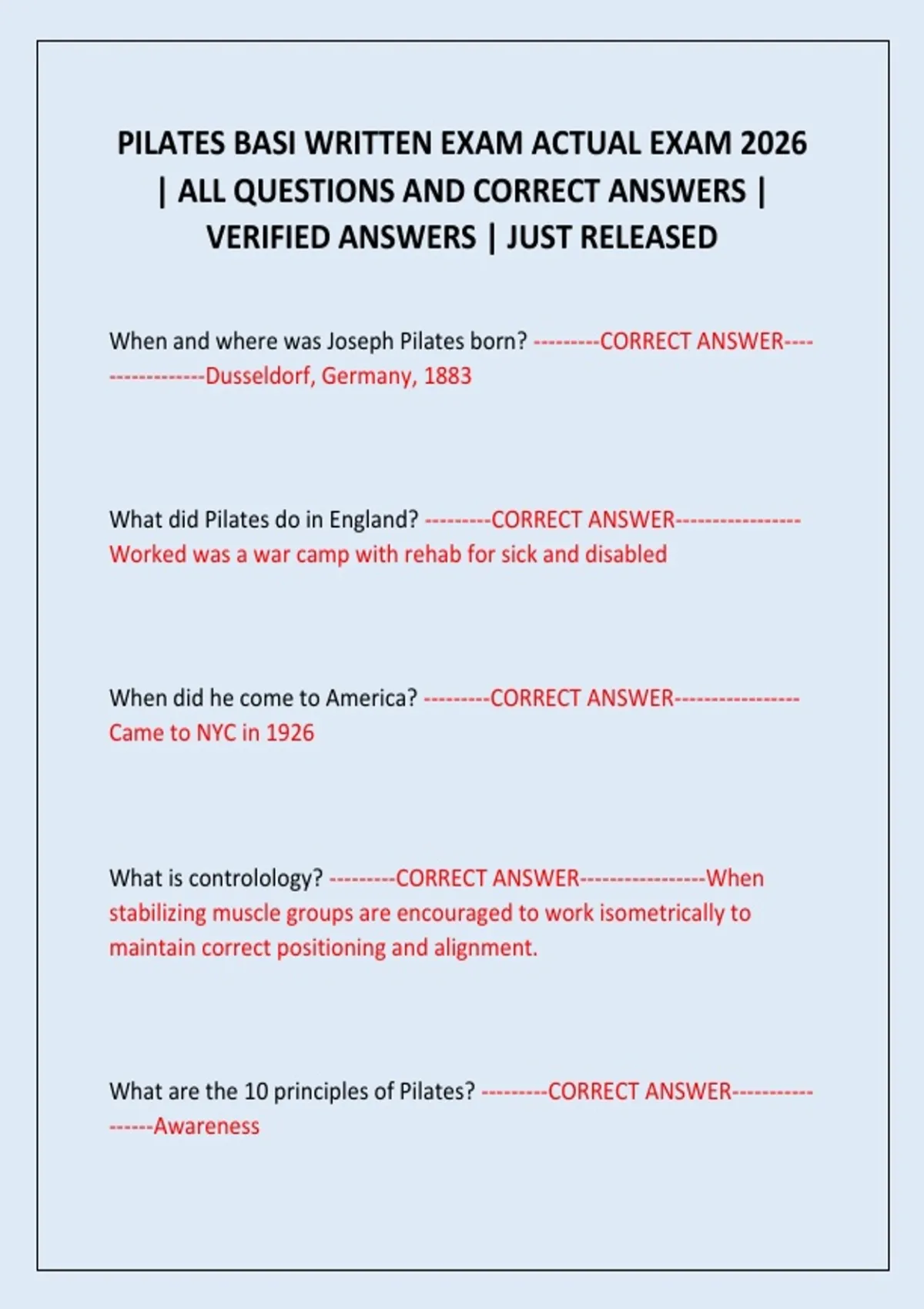 PILATES BASI WRITTEN EXAM ACTUAL EXAM 2026 | ALL QUESTIONS AND CORRECT ANSWERS | VERIFIED ANSWERS | JUST RELEASED