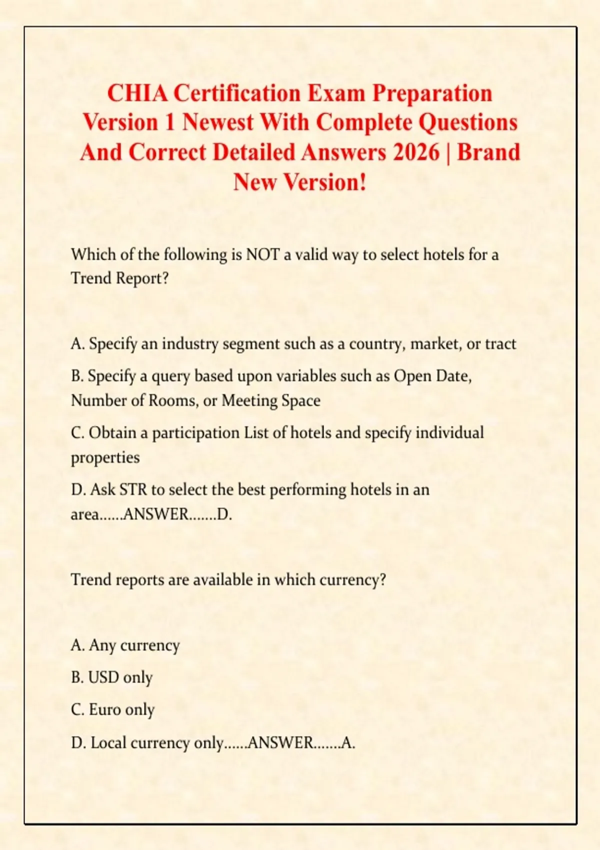 Description: Prepare for the CHIA (Certified Hotel Industry Analyst) certification exam with this comprehensive 2026 version study guide. Includes complete practice questions and detailed answers covering key topics such as: Trend Reports, Pipeline Reports, HOST/Profitability Reports Competitive Set Analysis, Benchmarking, KPIs (Occupancy, ADR, RevPAR) STR Reporting, Market Segmentation, Hotel Classifications & Scales Industry Data Modeling, STAR Reports, Destination Reports, and Ad-Hoc Reports Geographic & Non-Geographic Categories, Hotel Affiliations, and Performance Metrics Perfect for hospitality professionals, revenue managers, and students seeking CHIA certification.