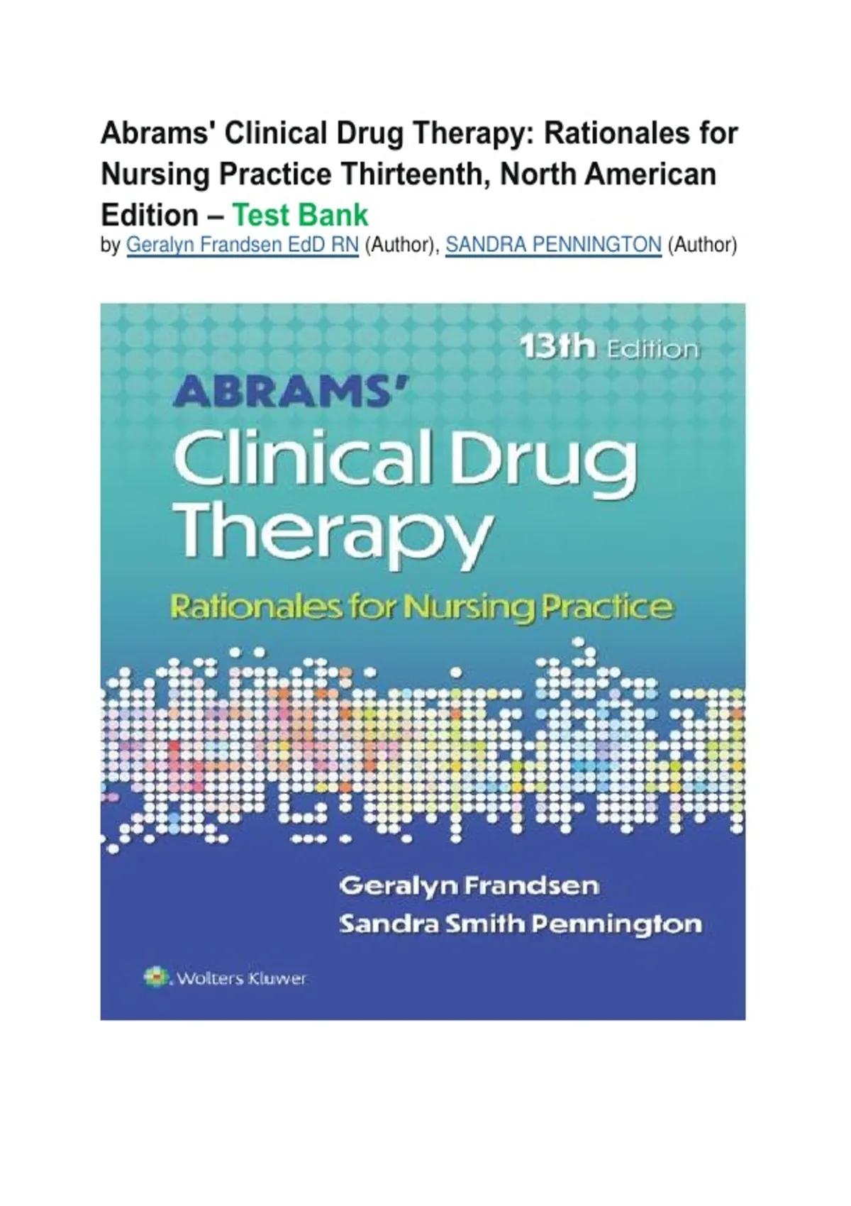 TEST BANK for Abrams' Clinical Drug Therapy: Rationales for Nursing Practice Thirteenth, North American Edition by (Frandsen, 2024) Newest Edition
