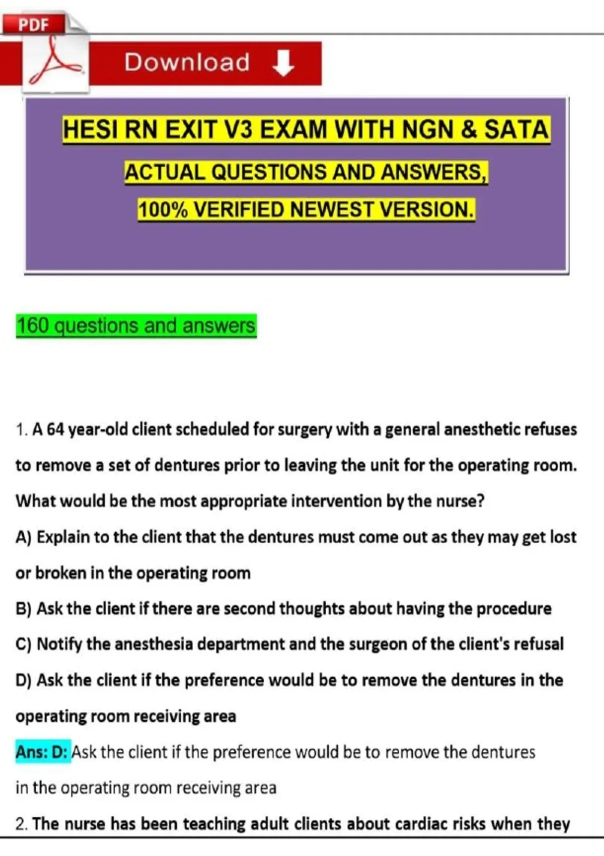 This RN HESI Exit Exam V3 study document includes NGN and SATA-style questions with verified answers. It supports final nursing exam preparation and clinical judgment development for RN students.