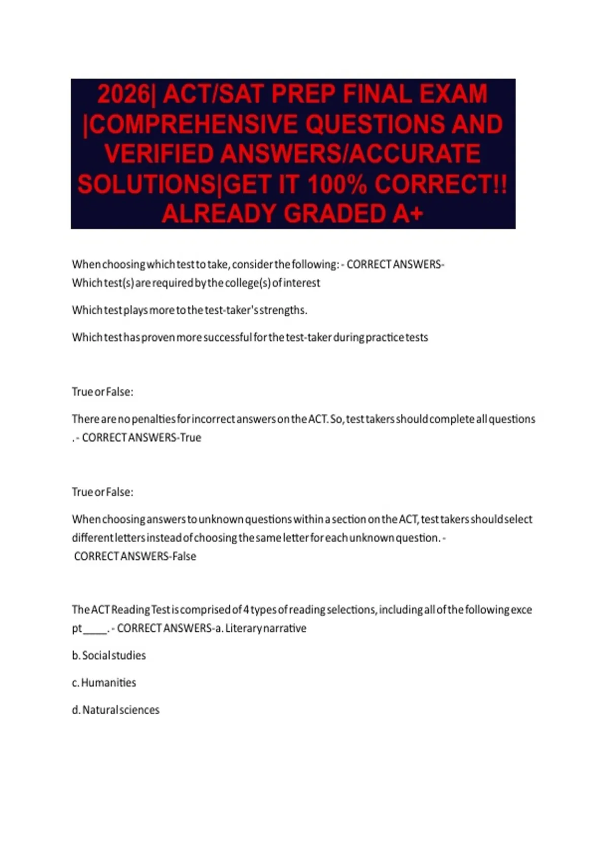 2026 ACTSAT PREP FINAL EXAM COMPREHENSIVE QUESTIONS AND VERIFIED ANSWERS .ACCURATE