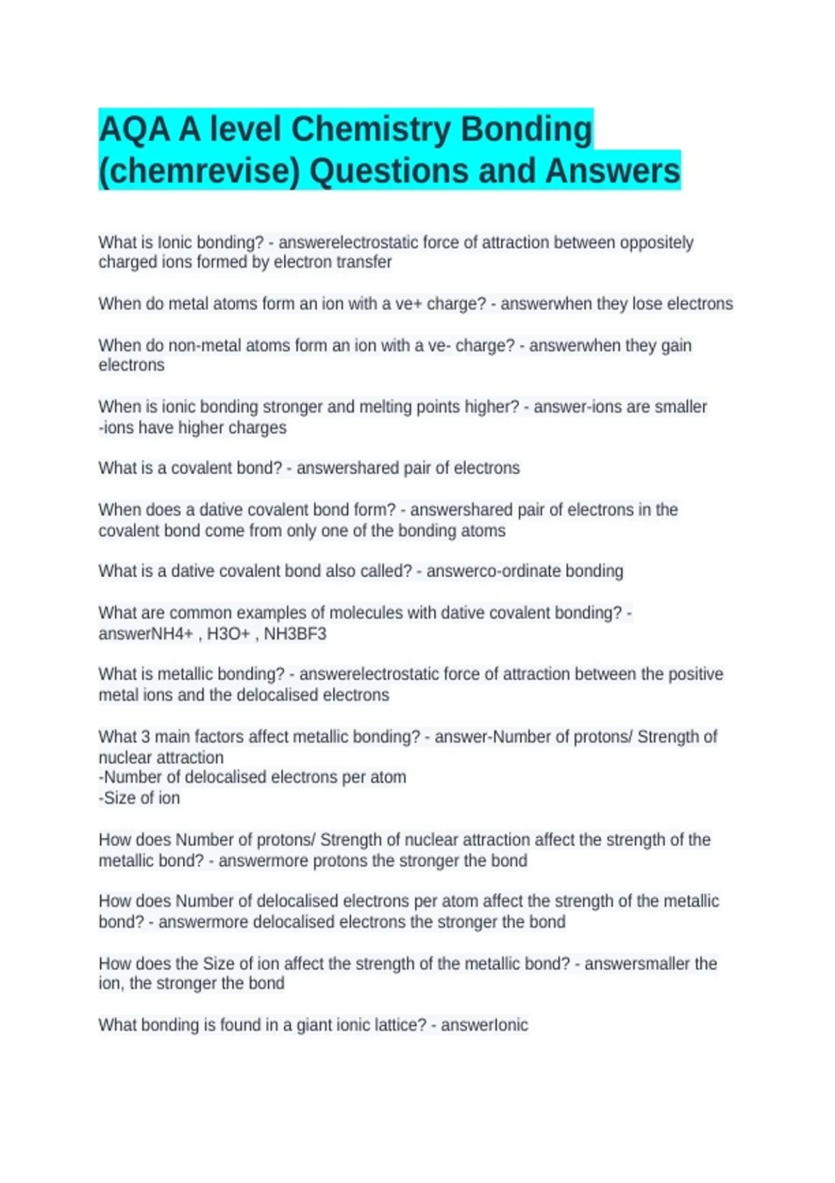 AQA A level Chemistry Bonding (chemrevise) Questions and Answers