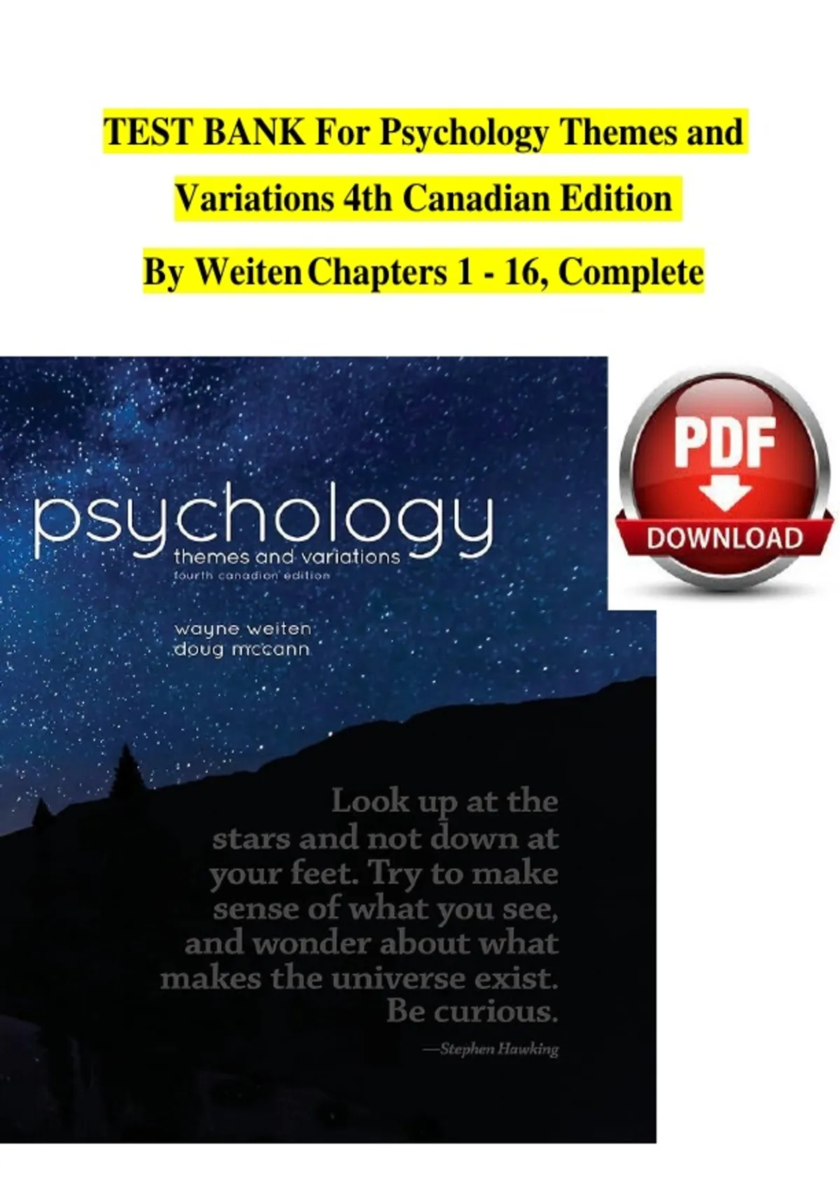 Master your psychology coursework with the Psychology: Themes and Variations (4th Canadian Edition) Test Bank by Weiten. This complete collection offers multiple-choice, conceptual, and applied questions across all 16 chapters, covering research methods, biological bases of behavior, sensation and perception, learning, memory, cognition, development, personality, psychological disorders, and social psychology. Ideal for psychology students seeking to reinforce key concepts and prepare effectively for exams.