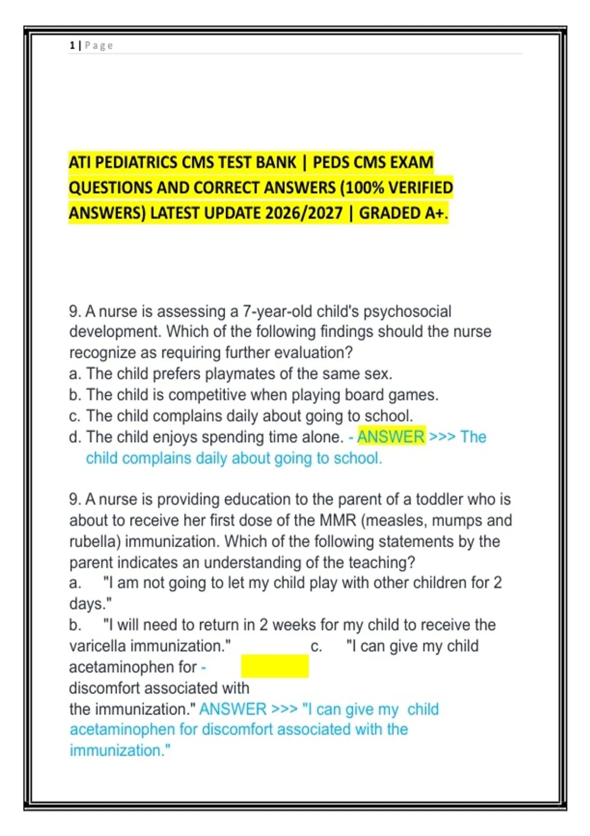 ATI PEDIATRICS CMS TEST BANK | PEDS CMS EXAM