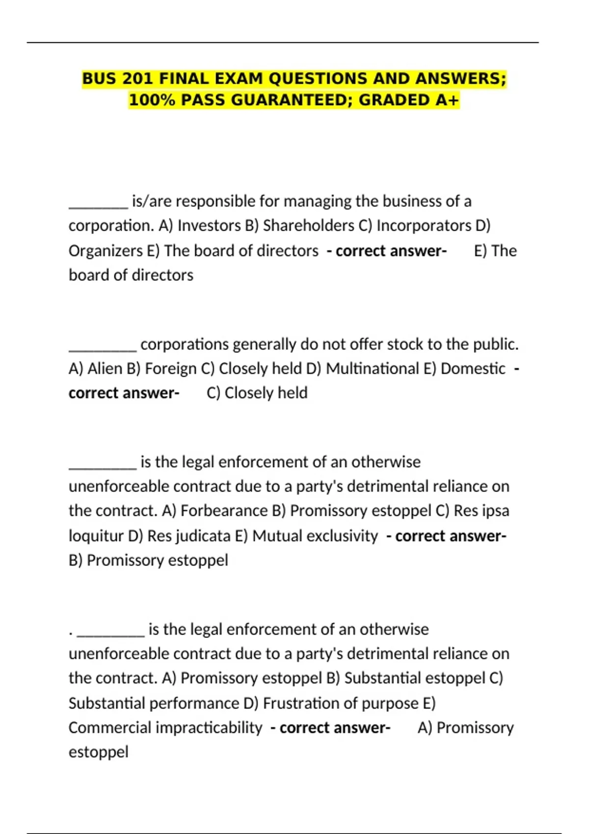 Ace your BUS 201 final exam with this complete review. Includes 100% verified questions and answers on contracts, corporations, agency law, UCC, and bankruptcy—graded A+ and pass guaranteed.