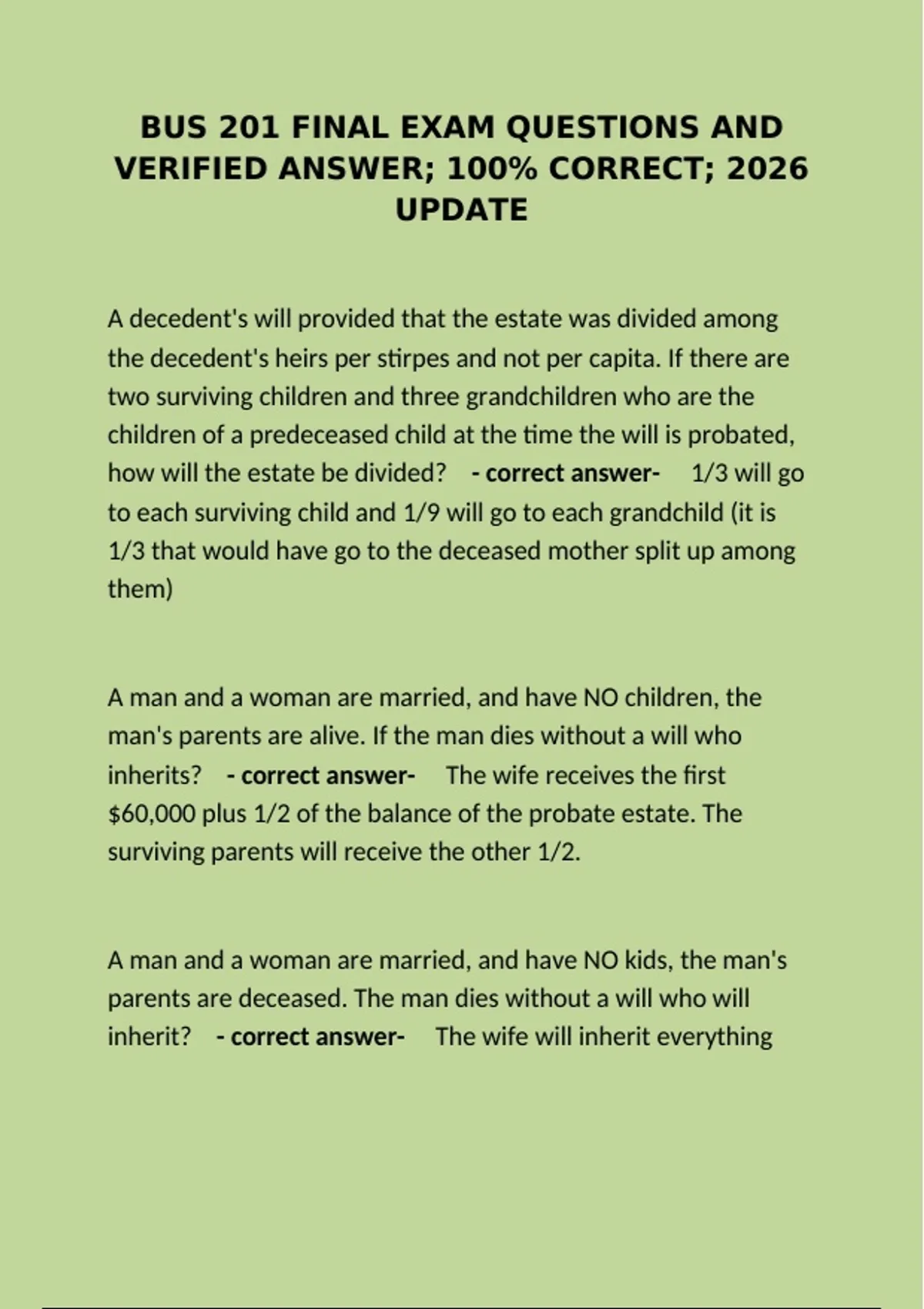 Get 100% on your BUS 201 final with this 2026 updated guide. Verified answers on wills, trusts, corporations, ethics, international law, and estate planning—complete study resource.