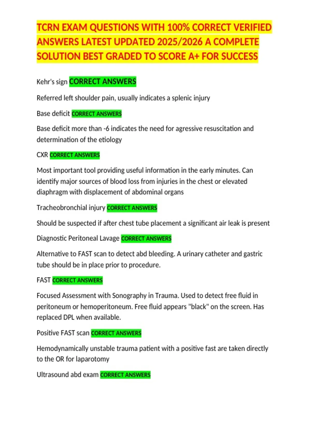 , TCRN EXAM QUESTIONS WITH 100% CORRECT VERIFIED