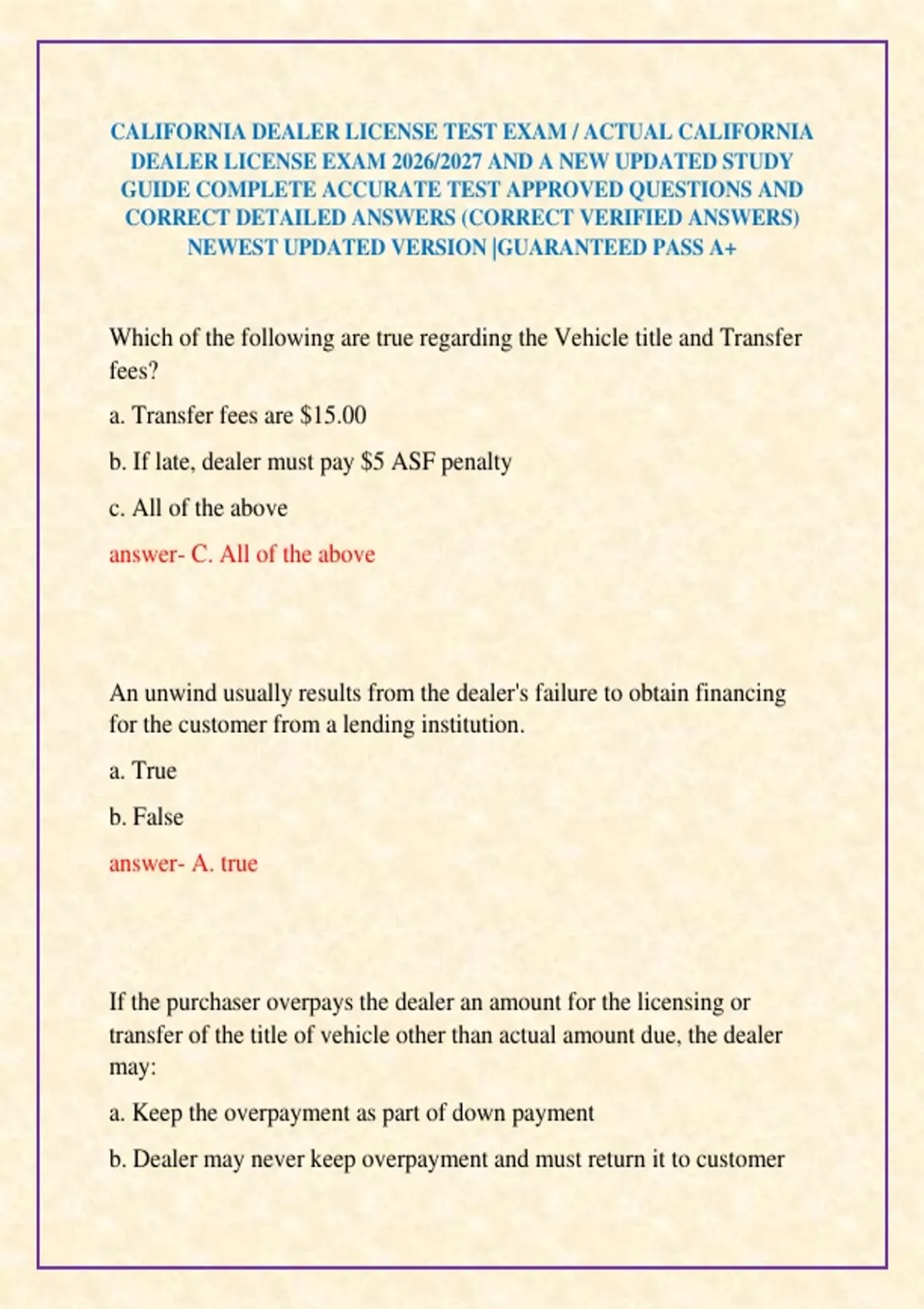 ,answer- b. Dealer may never keep overpayment and must return it to