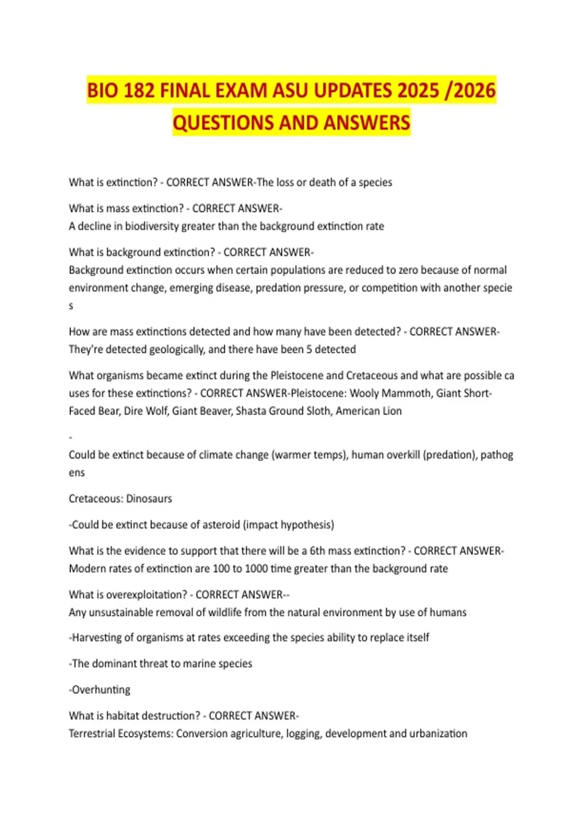 BIO 182 FINAL EXAM ASU UPDATES 2026 CORRECT QUESTIONS AND VERIFIED ANSWERS