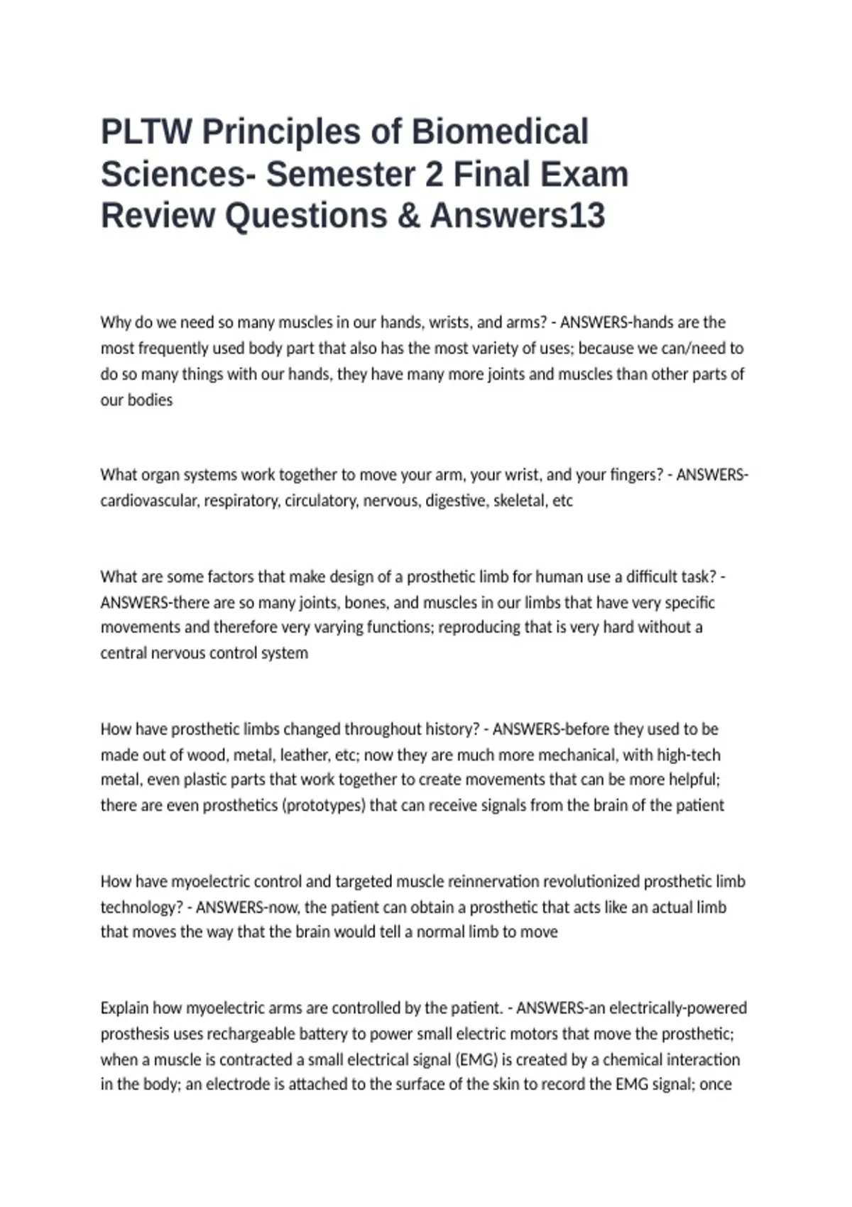 PLTW Principles of Biomedical Sciences- Semester 2 Final Exam Review Questions & Answers