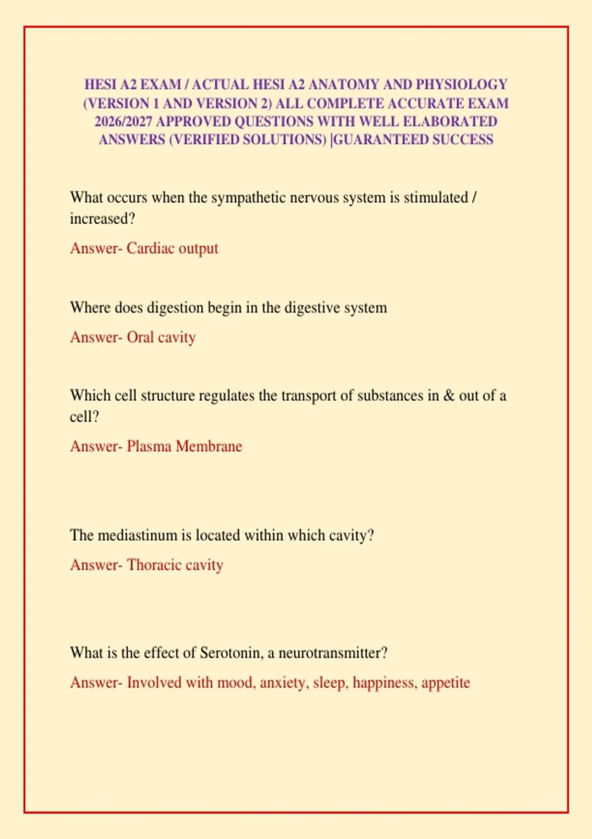 HESI A2 EXAM / ACTUAL HESI A2 ANATOMY AND PHYSIOLOGY (VERSION 1 AND VERSION 2) ALL COMPLETE ACCURATE EXAM 2026/2027 APPROVED QUESTIONS WITH WELL ELABORATED ANSWERS (VERIFIED SOLUTIONS) |GUARANTEED SUCCESS