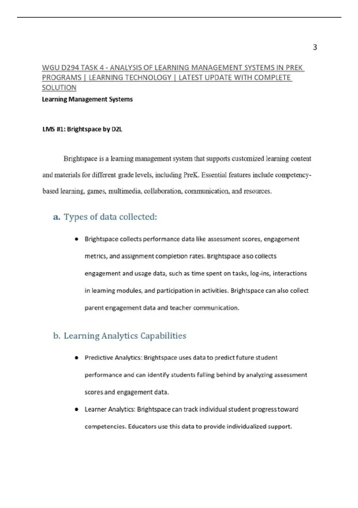 WGU D294 TASK 4 - ANALYSIS OF LEARNING MANAGEMENT SYSTEMS IN PREK PROGRAMS | LEARNING TECHNOLOGY | LATEST UPDATE WITH COMPLETE SOLUTION