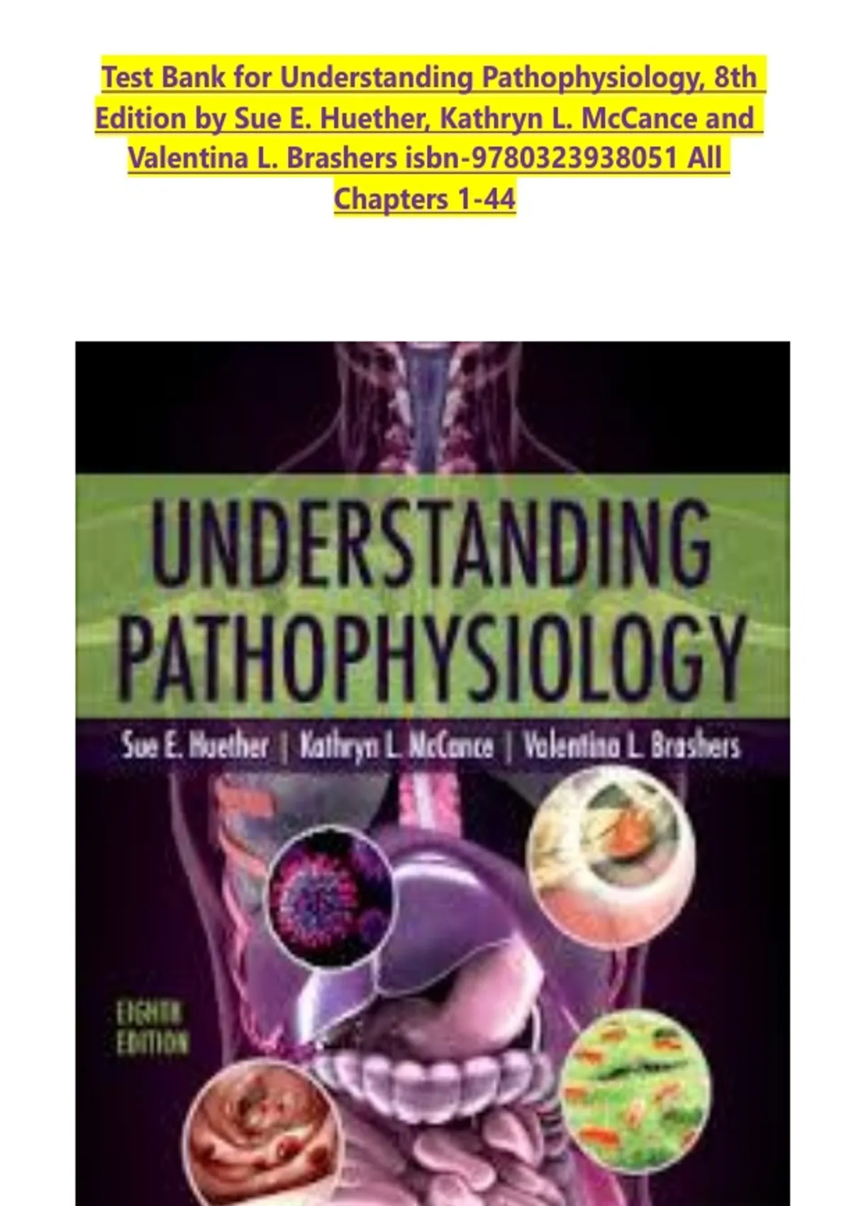 This document contains the complete test bank for Understanding Pathophysiology, 8th Edition by Sue E. Huether, Kathryn L. McCance, and Valentina L. Brashers, fully covering all chapters from 1 through 44. It is specifically designed to support students in nursing, medicine, and other health sciences by providing extensive exam-style questions that reflect the structure, depth, and learning objectives of the official textbook. The test bank includes a broad range of questions focused on core pathophysiological concepts, including cellular injury, inflammation, immunity, genetics, fluid and electrolyte balance, cardiovascular disorders, respiratory conditions, neurological diseases, endocrine disorders, gastrointestinal pathologies, renal and urinary conditions, reproductive health, musculoskeletal disorders, hematologic diseases, and multisystem dysfunctions. Questions are formulated to assess both theoretical understanding and clinical application, helping students strengthen critical thinking and exam readiness. This document is ideal for exam preparation, practice testing, self-assessment, and revision, whether used independently or alongside lectures and study notes. Because it spans the entire textbook, it is suitable for full-course coverage and final exam preparation. The content is structured to mirror real exam difficulty levels, making it a valuable resource for students aiming to improve performance, reinforce weak areas, and gain confidence in pathophysiology exams.