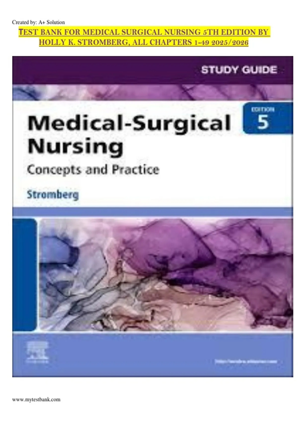 This document is a complete test bank for Medical-Surgical Nursing, 5th Edition by Holly K. Stromberg, covering all chapters from 1 to 49 and aligned with the 2025/2026 academic year. It is designed to support nursing students with comprehensive exam-style questions that closely follow the textbook’s content, learning objectives, and clinical focus, making it an essential resource for medical-surgical nursing courses. The test bank includes extensive coverage of foundational and advanced medical-surgical nursing topics, such as perioperative care, fluid and electrolyte balance, pain management, infection control, cardiovascular disorders, respiratory conditions, gastrointestinal and hepatic diseases, renal and urinary disorders, neurological conditions, endocrine disorders, musculoskeletal problems, hematologic conditions, immune disorders, oncologic nursing, and multisystem health issues. Questions emphasize clinical reasoning, prioritization, nursing interventions, patient safety, and evidence-based practice, reflecting real exam and NCLEX-style expectations.