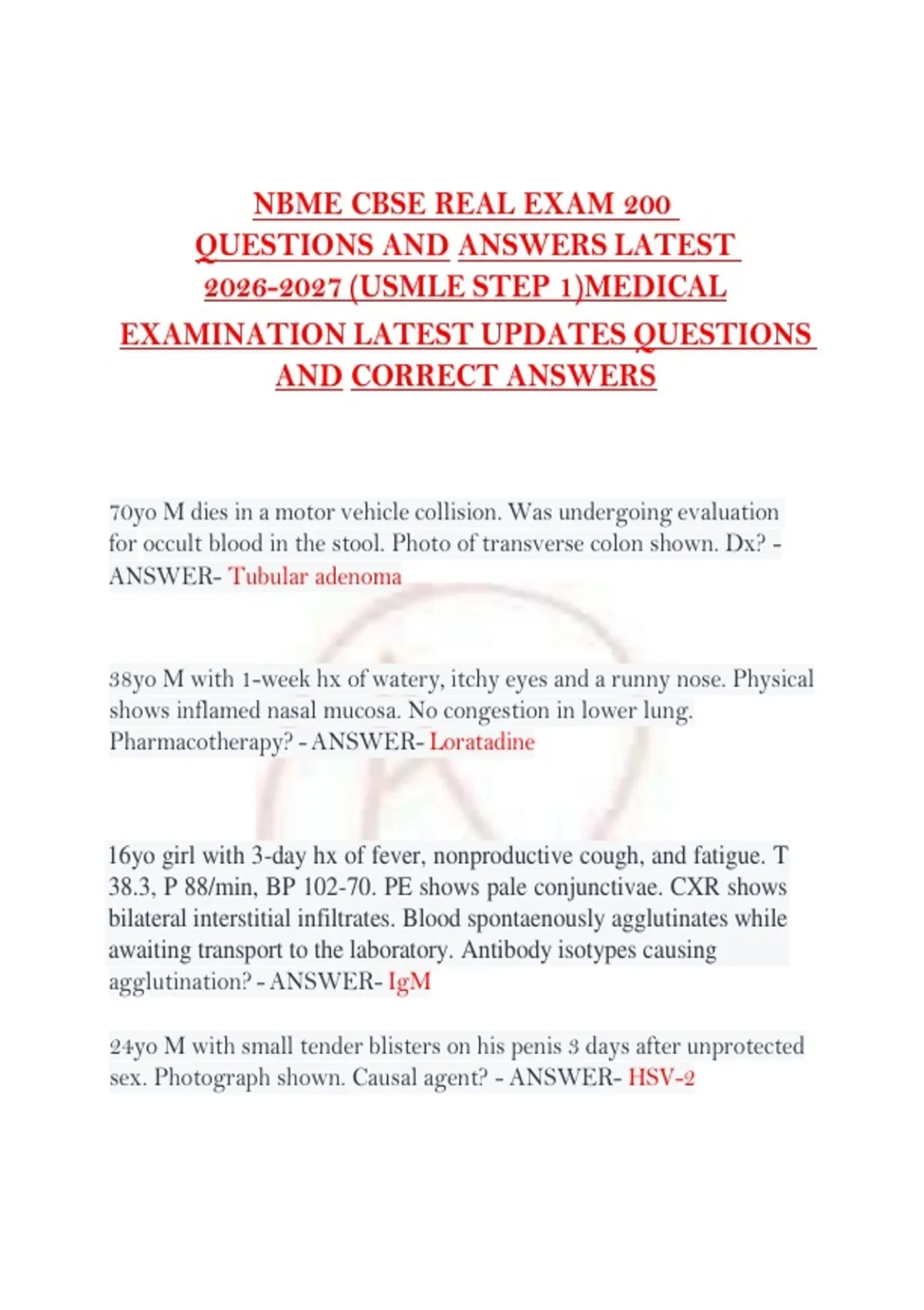This document is a complete and verified question bank for the NBME CBSE Real Exam 2026–2027, containing 200 actual exam questions with accurate, detailed answers. Designed for medical students preparing for USMLE Step 1, it provides an authentic and high-yield resource that reflects the latest exam updates, format, and clinical relevance. The test bank covers all essential preclinical subjects tested on Step 1, including Anatomy, Physiology, Biochemistry, Pathology, Microbiology, Pharmacology, Behavioral Science, Genetics, Immunology, and Biostatistics/Epidemiology. Each question comes with a verified correct answer and detailed explanation, enabling students to understand the reasoning behind each solution, identify knowledge gaps, and strengthen clinical reasoning skills. This resource emphasizes critical thinking, problem-solving, and application of foundational medical knowledge, preparing students for both the NBME CBSE and USMLE Step 1 exams. It is ideal for self-assessment, mock exams, revision, and high-yield review, helping students improve speed, accuracy, and confidence under exam conditions. NBME CBSE 2026–2027 test bank USMLE Step 1 practice questions medical exam verified answers CBSE real exam questions high-yield USMLE Step 1 prep medical student self-assessment preclinical exam practice NBME CBSE mock test questions verified correct answers CBSE USMLE Step 1 latest updates