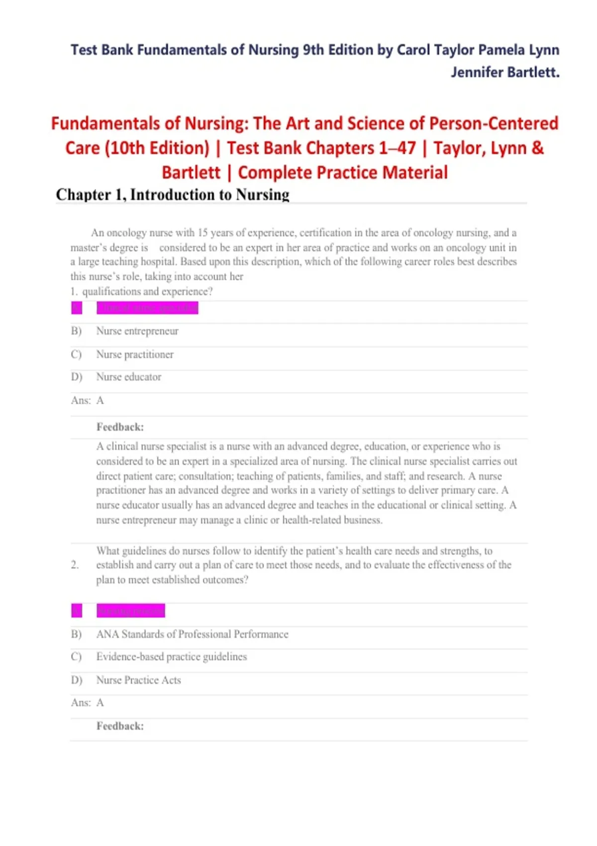 This document provides a comprehensive test bank for Fundamentals of Nursing: The Art and Science of Person-Centered Care (10th Edition) by Carol R. Taylor, Pamela B. Lynn, and Jennifer L. Bartlett. It includes chapter-by-chapter practice questions covering all chapters 1–47, supporting mastery of core nursing fundamentals and person-centered care concepts.
