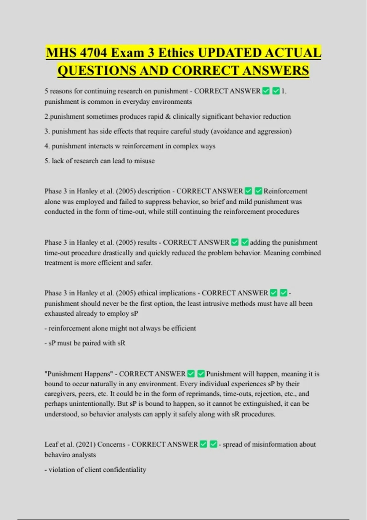 MHS 4704 Exam 3 Ethics UPDATED ACTUAL QUESTIONS AND CORRECT ANSWERS 5 reasons for continuing research on punishment - CORRECT ANSWER punishment is common in everyday environments 1. hment sometimes produces rapid & clinically significant behavior reduction 3. punishment has side effects that require careful study (avoidance and aggression) 4. punishment interacts w reinforcement in complex ways 5. lack of research can lead to misuse Phase 3 in Hanley et al. (2005) description - CORRECT ANSWER Reinforcement alone was employed and failed to suppress behavior, so brief and mild punishment was conducted in the form of time-out, while still continuing the reinforcement procedures Phase 3 in Hanley et al. (2005) results - CORRECT ANSWER adding the punishment time-out procedure drastically and quickly reduced the problem behavior. Meaning combined treatment is more efficient and safer. Phase 3 in Hanley et al. (2005) ethical implications - CORRECT ANSWER - punishment should never be the first option, the least intrusive methods must have all been exhausted already to employ sP - reinforcement alone might not always be efficient - sP must be paired with sR "Punishment Happens" - CORRECT ANSWER Punishment will happen, meaning it is bound to occur naturally in any environment. Every individual experiences sP by their caregivers, peers, etc. It could be in the form of reprimands, time-outs, rejection, etc., and perhaps unintentionally. But sP is bound to happen, so it cannot be extinguished, it can be understood, so behavior analysts can apply it safely along with sR procedures.