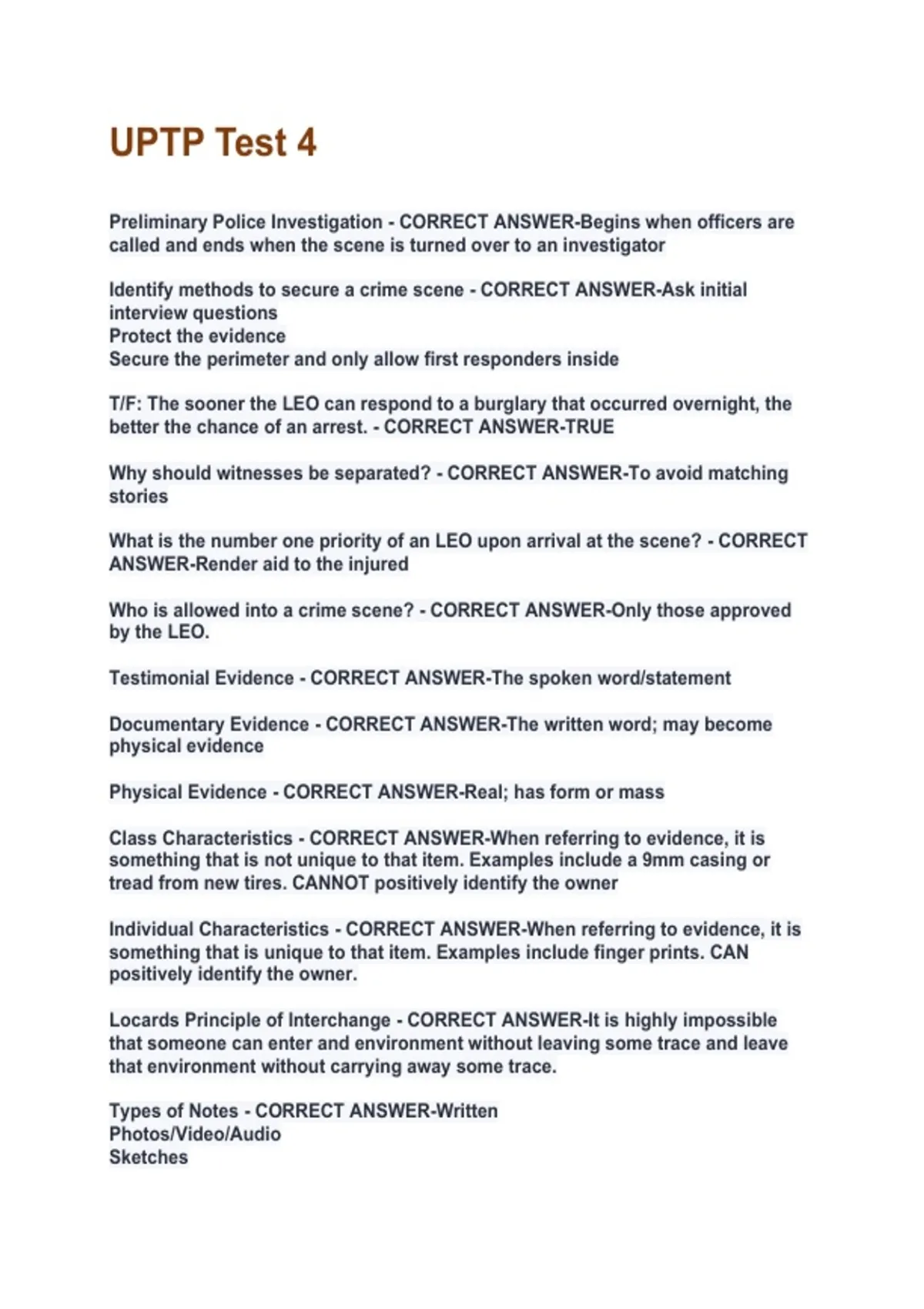 Preliminary Police Investigation - CORRECT ANSWER-Begins when officers are called and ends when the scene is turned over to an investigator Identify methods to secure a crime scene - CORRECT ANSWER-Ask initial interview questions Protect the evidence Secure the perimeter and only allow first responders inside T/F: The sooner the LEO can respond to a burglary that occurred overnight, the better the chance of an arrest. - CORRECT ANSWER-TRUE Why should witnesses be separated? - CORRECT ANSWER-To avoid matching stories What is the number one priority of an LEO upon arrival at the scene? - CORRECT ANSWER-Render aid to the injured Who is allowed into a crime scene? - CORRECT ANSWER-Only those approved by the LEO. Testimonial Evidence - CORRECT ANSWER-The spoken word/statement Documentary Evidence - CORRECT ANSWER-The written word; may become physical evidence Physical Evidence - CORRECT ANSWER-Real; has form or mass Class Characteristics - CORRECT ANSWER-When referring to evidence, it is something that is not unique to that item. Examples include a 9mm casing or tread from new tires. CANNOT positively identify the owner Individual Characteristics - CORRECT ANSWER-When referring to evidence, it is something that is unique to that item. Examples include finger prints. CAN positively identify the owner. Locards Principle of Interchange - CORRECT ANSWER-It is highly impossible that someone can enter and environment without leaving some trace and leave that environment without carrying away some trace. Types of Notes - CORRECT ANSWER-Written Photos/Video/Audio SketchesWhat do field notes begin with? - CORRECT ANSWER-The date/time you received the call If you make an error in your notes... - CORRECT ANSWER-Draw a single line through it. Where should you measure from in a crime scene? - CORRECT ANSWER-Fixed points (corners of a room, doors, windows, etc.) What are the 3 perspectives of photography? - CORRECT ANSWER-Overall Intermediate Close up (with scale) Chain of Custody - CORRECT ANSWER-A document that details the life of a piece of evidence, from the time it was discovered to the time it is no longer needed. This includes anyone who takes possession of the item