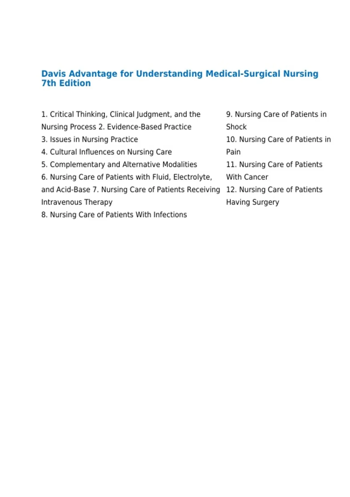 This complete test bank for Davis Advantage for Understanding Medical-Surgical Nursing (7th Edition) provides comprehensive, chapter-by-chapter exam questions with detailed rationales to support nursing students in mastering core medical-surgical concepts. It covers assessment, pathophysiology, pharmacologic and nonpharmacologic management, priority nursing interventions, patient safety, clinical judgment, and evidence-based practice. Perfect for quizzes, unit exams, midterms, finals, and NCLEX-style preparation, this test bank is designed to improve understanding, boost confidence, and support A+ academic performance in medical-surgical nursing courses. SEO Keywords Davis Advantage test bank, Understanding Medical-Surgical Nursing 7th Edition test bank, med surg nursing exam questions, medical surgical nursing test bank, NCLEX style questions med surg, nursing exam prep test bank, Davis Advantage nursing test bank If you want, I can also create ultra-long titles, meta descriptions, or bulk SEO formatting for all your nursing and medical test banks.