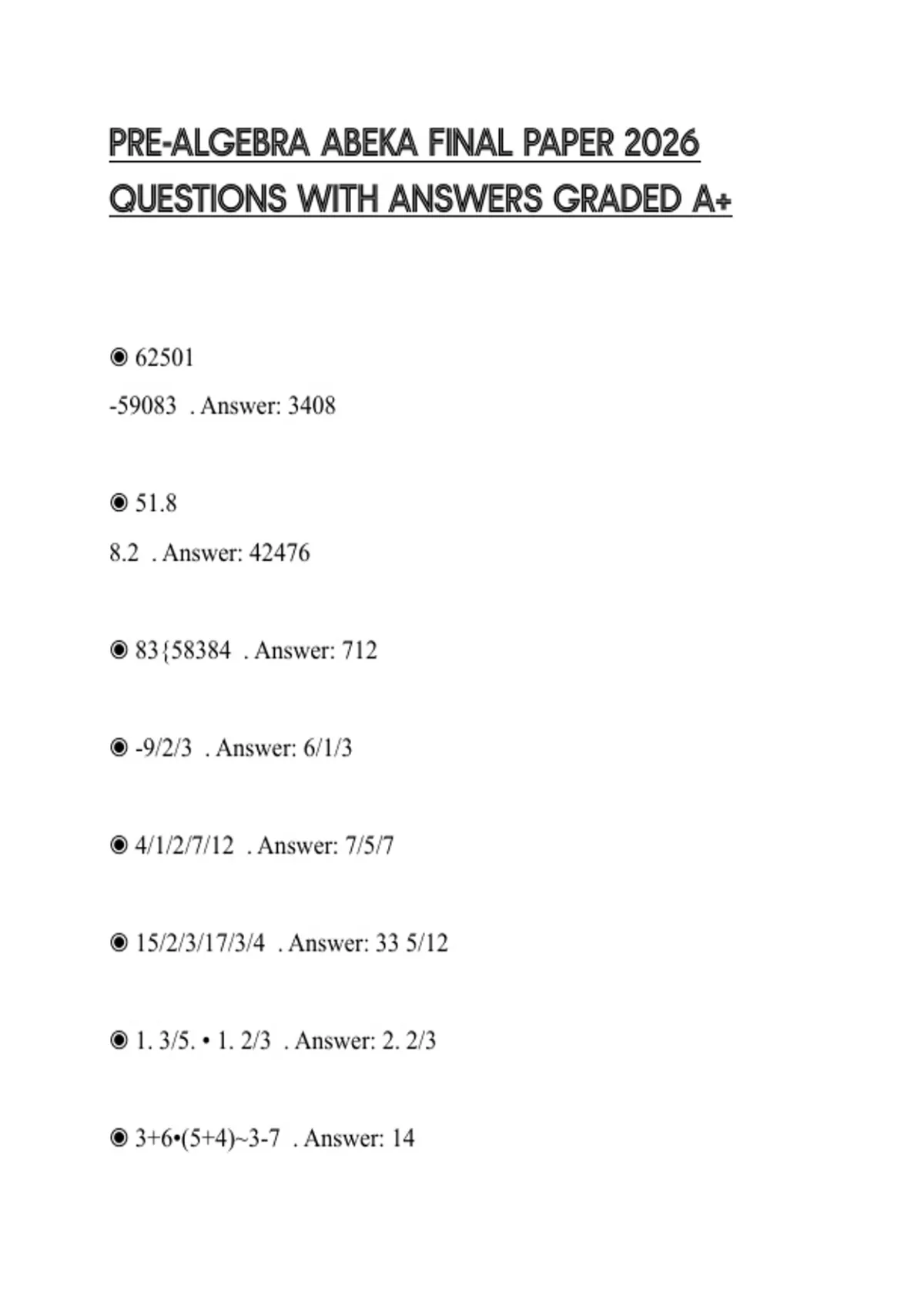 PRE-ALGEBRA ABEKA FINAL PAPER 2026 QUESTIONS WITH ANSWERS GRADED A+