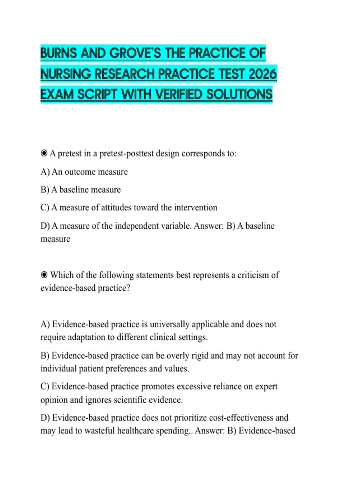 BURNS AND GROVE’S THE PRACTICE OF NURSING RESEARCH PRACTICE TEST 2026 EXAM SCRIPT WITH VERIFIED SOLUTIONS