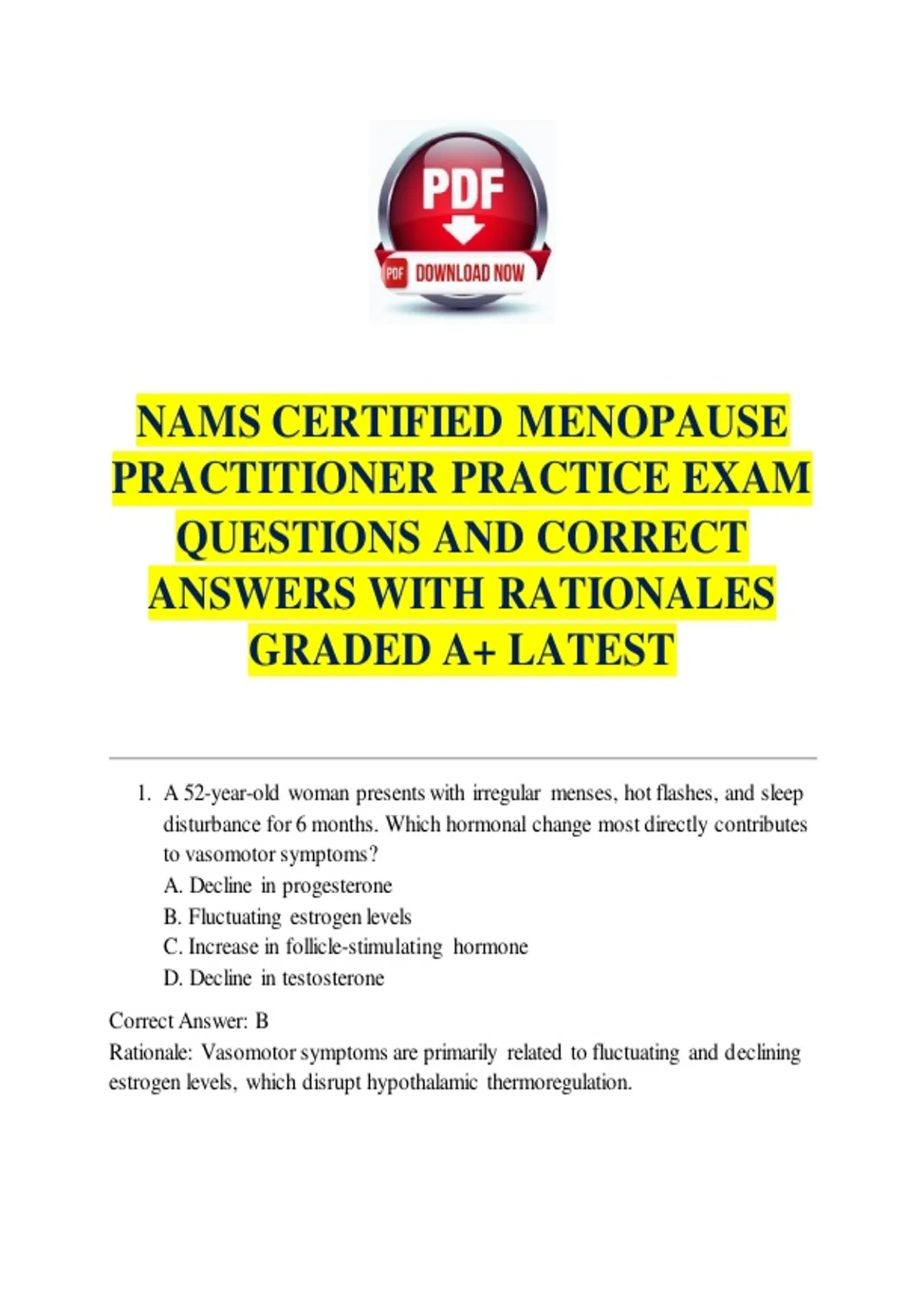 NAMS CERTIFIED MENOPAUSE PRACTITIONER PRACTICE EXAM QUESTIONS AND CORRECT ANSWERS WITH RATIONALES GRADED A+ LATEST NAMS Certified Menopause Practitioner Practice Exam (200 Questions) This practice exam is designed for clinicians preparing for the NAMS Certified Menopause Practitioner (NCMP) exam. It includes 200 multiple-choice questions with moderate to challenging difficulty, featuring scenario-based and application-focused items. Content covers menopause management, hormone therapy, genitourinary syndrome of menopause (GSM), gynecologic health, osteoporosis prevention, cardiovascular risk, and midlife wellness. Each question includes a detailed rationale to support learning and exam readiness.